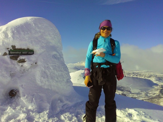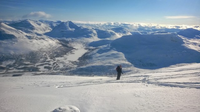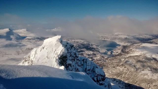Huipulle päästyämme oli onnekkaasti kirkasta joka suunnalla, ja maisemat olivat todella komeat kuten Nina oli etukäteen jo kehunutkin. Kiitimme tunturia hyvästä huiputussäästä ja kirjasimme nimet kävijävihkoon, joka oli tällä kertaa niin ovelasti piilotettu etteivät muut päivän kävijät olleet sitä edes löytäneet. Pilvet alkoivat kasaantua taivaalle ja lähdimme ripeästi alaspäin ettei jo ansaittu hyvä lasku menisi huonon näkyvyyden takia hukkaan. Varsinkin alkuosuus oli varsinaista vapaalaskun juhlaa; lumi oli syvää, kevyttä ja koskemattomia linjoja riitti. Myöhemmin rinne loiveni ja laskeminen muuttui enemmän kruisailuksi vaikkakin laskureitin etsintää joutui harrastamaan enemmän. Takaisin autolle päästyämme oltiin vähän väsyneitä ja paljon onnellisia, ja toivottiin että saataisiin näitä päiviä vielä lisää.