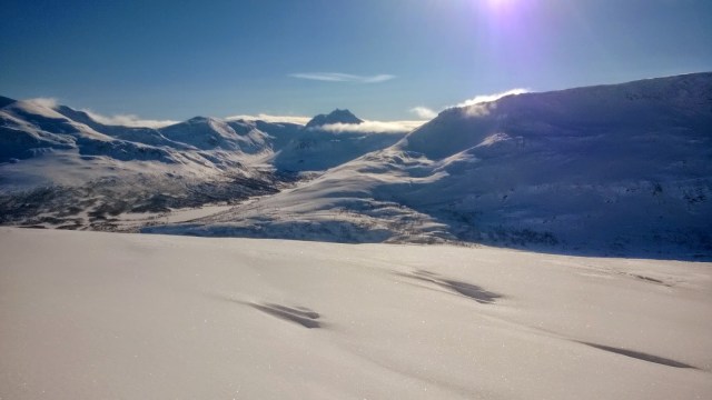 | Tätä lähdettiin hakemaan; vuoristomaisemia, koskematonta hankea ja kevätaurinkoa |