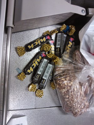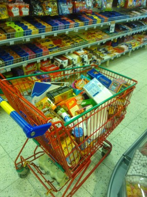 | Karkkihyllyn kautta kassalle, näillä eväillä luulisi kahden naisen yhden viikon ajan pärjäävän |