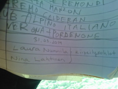 | Kiipeilysohlojen visiitti Spanstindenin huipulla tuli merkattua vierailijakirjaan |