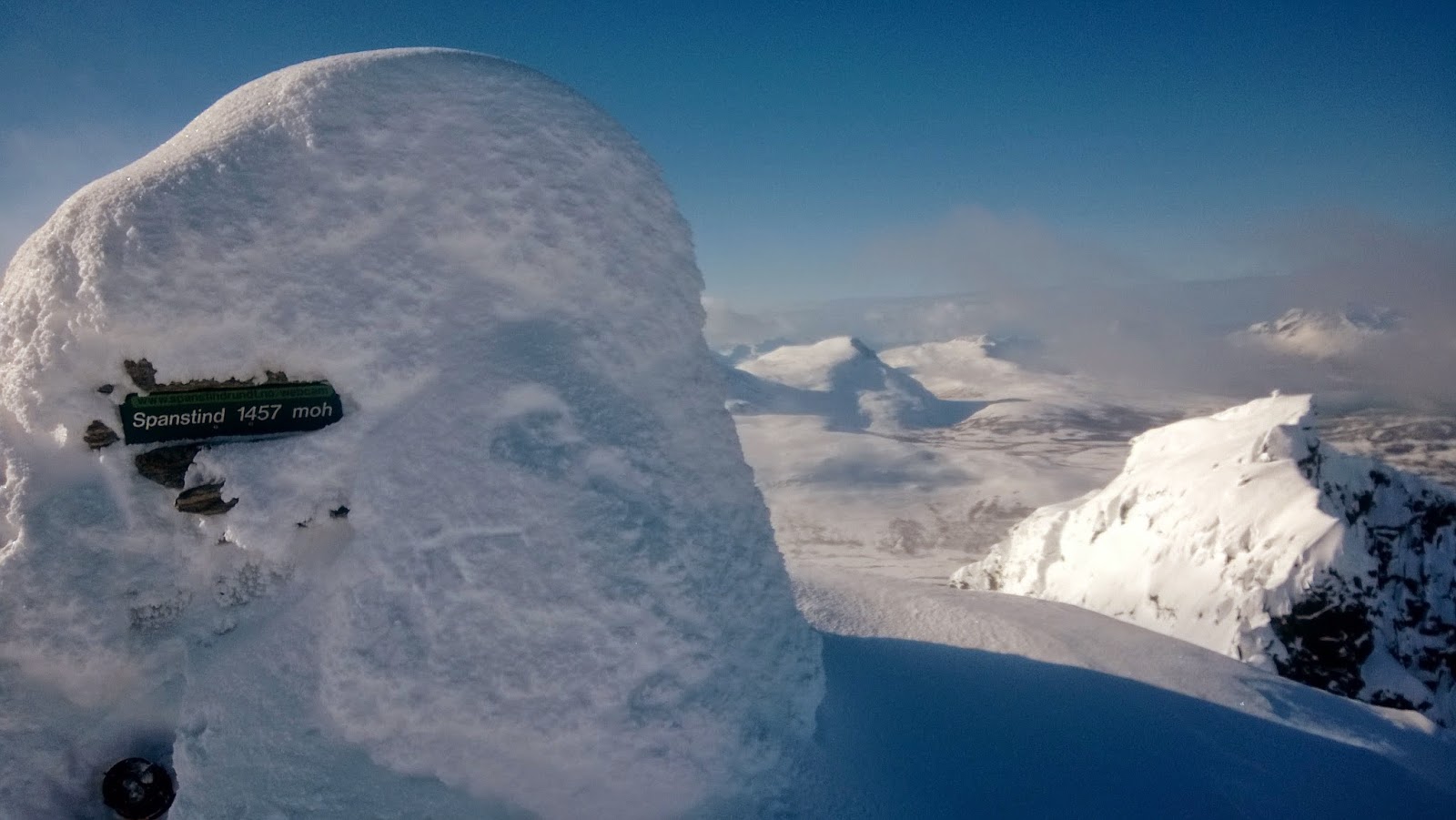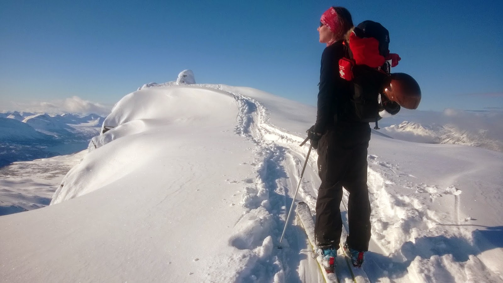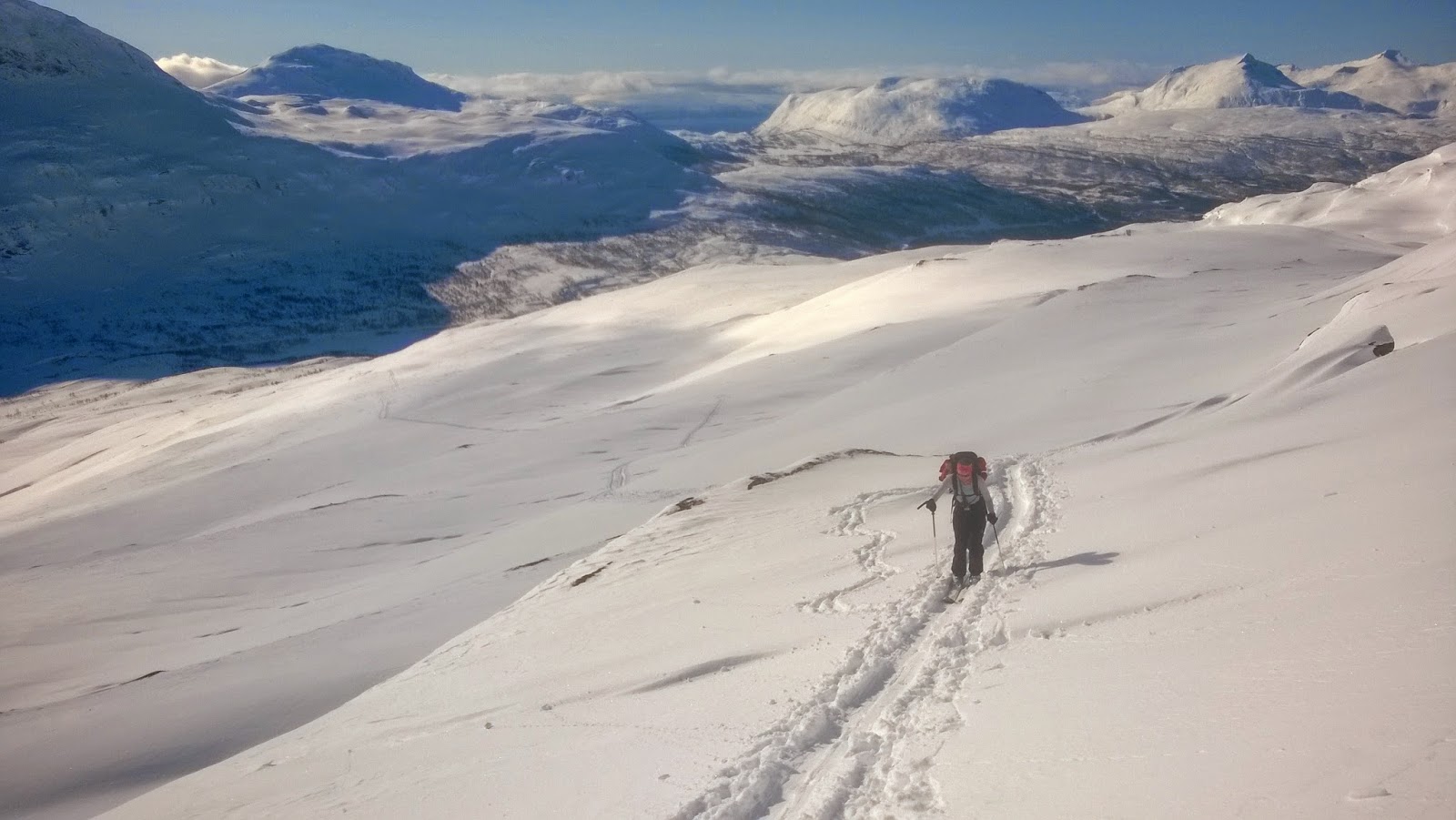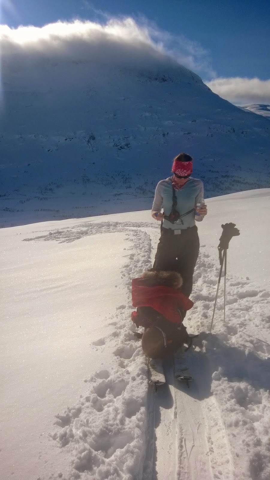 Huipulle päästyämme oli onnekkaasti kirkasta joka suunnalla, ja maisemat olivat todella komeat kuten Nina oli etukäteen jo kehunutkin. Kiitimme tunturia hyvästä huiputussäästä ja kirjasimme nimet kävijävihkoon, joka oli tällä kertaa niin ovelasti piilotettu etteivät muut päivän kävijät olleet sitä edes löytäneet. Pilvet alkoivat kasaantua taivaalle ja lähdimme ripeästi alaspäin ettei jo ansaittu hyvä lasku menisi huonon näkyvyyden takia hukkaan. Varsinkin alkuosuus oli varsinaista vapaalaskun juhlaa; lumi oli syvää, kevyttä ja koskemattomia linjoja riitti. Myöhemmin rinne loiveni ja laskeminen muuttui enemmän kruisailuksi vaikkakin laskureitin etsintää joutui harrastamaan enemmän. Takaisin autolle päästyämme oltiin vähän väsyneitä ja paljon onnellisia, ja toivottiin että saataisiin näitä päiviä vielä lisää.