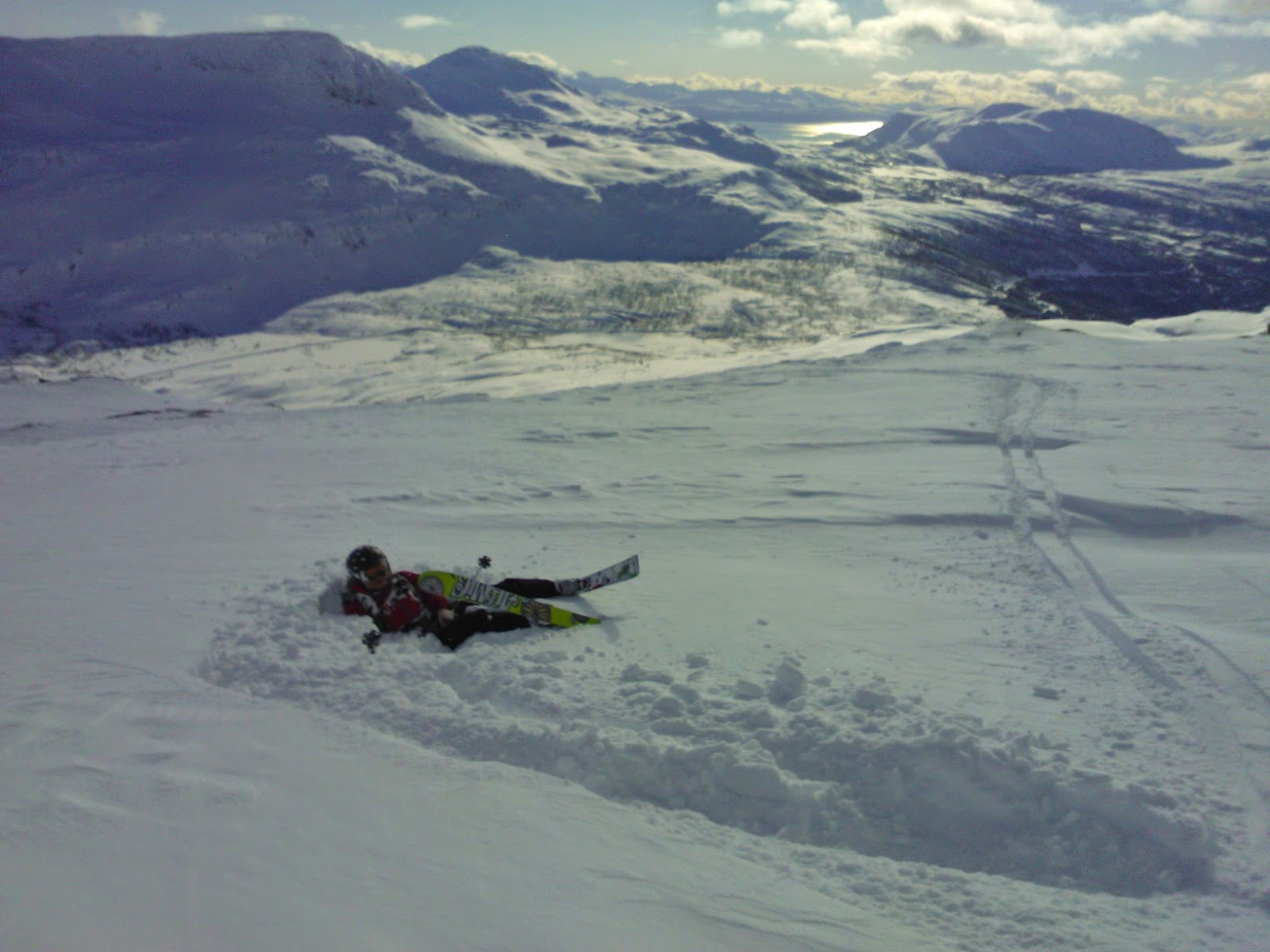 Sitkeästä pollauksesta huolimatta kaikkien ulkoilukelien oraakkeli yr.no ei kuitenkaan suostunut muuttamaan näkemystään seuraavien päivien säästä, ja tiistaina lähdettiin rannikolta sisämaahan pahinta lumisaderintamaa pakoon. Riksgränsenin hiihtokeskus sijaitsee Narvikista vain 40 minuutin ajomatkan päässä, ja tarjoaa paitsi rinteitä myös loistavia mahdollisuuksia omien laskulinjojen etsintään muualta rinteiden läheisyydestä. Uutta lunta oli edellisenä päivänä ilmeisesti satanut runsaasti, sillä tuntui että oltiin lähes ensimmäisten joukossa mesästämässä koskemattomia laskulinjoja. Kun vielä aurinkokin tuli esiin, tuli lähes välipäiväksi tuomitusta laskupäivästä niin hyvä että hissien suljettua päätettiin juhlistaa sitä paikallisella afterilla. Seuraksi saatiin suomalainen hiihdonopettaja-porukka, joilla oli meneillään useamman päivän koulutusretki rinteiden ulkopuolella laskemisesta. Ei yhtään hassumpaa ammattitaitoa syventävää koulutusta..