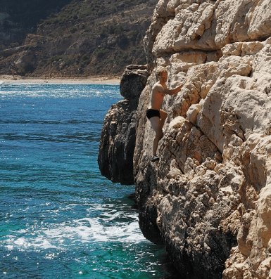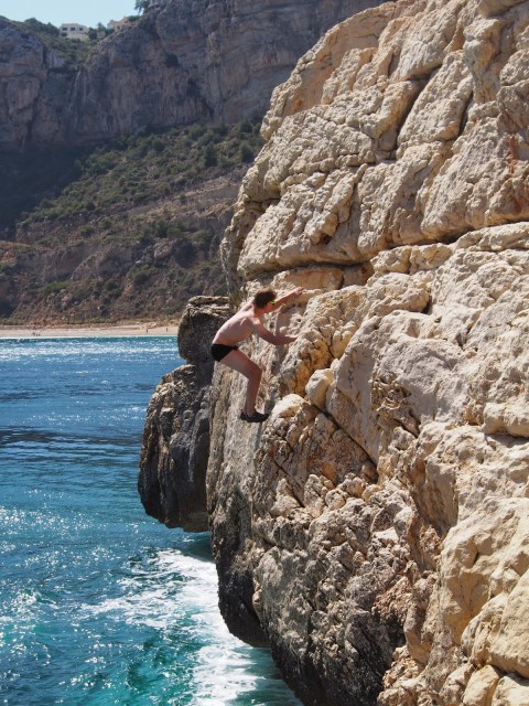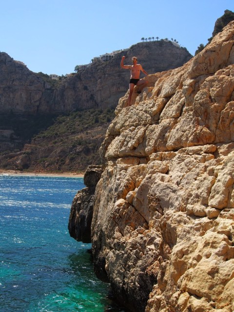 Päivän kiipeilyreitille lähestyessä tuli Espanjan auringon alla sen verran kuuma, että päätettiin pulahtaa hetkeksi Välimereen vilvoittelemaan ennen reitille lähtöä. Rantakallioilla kuivattelun ohessa Mikko suoritti sohlojen ensimmäisen DWS-reitin.
