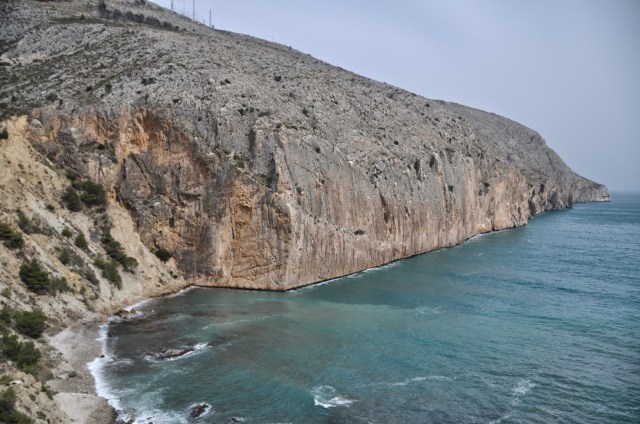 Ensimmäisenä päivänä päädyimme kiipeämään aivan Altean viereen Sierra de Toixin Oeste sektorille yhden köydenpituuden reittejä. Kohde valikoitua läheisen sijainnin lisäksi erittäin lyhyen lähestymisen ansiosta. Kovin paljoa ei itseä uskaltanut rasittaa, joten aloittelin ihan vaan liidaamalla helpon nelosen, joka oli kahden köydenpituuden reitin alaosa. Loppuvitosen raahauduin Mikon perässä, joka taisi vetäistä vielä pari reittiä meidän ”kotikalliolta”. Pakko hieman kehua tätä lähikallioita. Alue sijaitsee upeasti korkealla mäen päällä, josta on mahtavat maisemat Välimerelle ja Altean suuntaan. Alueella on useampi sektori joilla on reittejä varmaan enemmän kuin Helsingin lähikallioilla yhteensä. Reitit ovat sporttia ja pituudet vaihtelevat yhdestä köydenpituudesta useamman köydenpituuden reitteihin. Alapuolella olevalla rantakalliolla on lisää tiukempaa kiivettävää ja hieman kauempana rannalla Pirates of Caribbean -luola, mutta siitä lisää hieman myöhemmin. Lisäksi ”trädihenkisille” löytyy vierestä kanjoni, jossa on sekä lyhyttä että pitkää reittiä. Maininnan arvoista on ehkä se, että kanjonin pitkät reitit nousevat hienosti rantaa halkovan maantien sillan vierestä. Käsittämätön määrä monenlaista kiivettävää aivan kylän vieressä!
