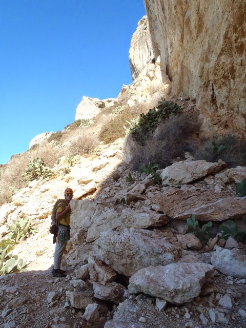 Tiistaina päätettiin ryhtyä vähitellen ”kiristämään ruuvia”. Suunnattiin Sierra de Toixin alapuolelle tavoitteena löytää Pirates of Caribbean luola netistä löytyneen topon avulla. Reitti kuvaus oli suuntaa antava, mutta annettu suunta ei oikein auennut meille. Kapusimme ensin korkealle meren yläpuolelle kalliolle ja aloimme arpoa, että mitä merta kohti jyrkästi viettävää kurua meidän pitäisikään päästä rantakallioiden päällä olevalle tasanteelle. Arvoimme oikeata kurua ja kävelimme edes takaisin jyrkässä kivikossa aikamme, mutta lopputulos oli huono. Ei löydetty mielestämme sopivaa reittiä alas. Pirates of Caribbean olisi ollut 60 metriä korkea luola rantakalliossa, jonne laskeudutaan luolan katossa olevasta reiästä ja sieltä sitten kolme köydenpituutta ylös samaan aukkoon. Tämä jäi nyt kokematta, mutta ehkä ensi kerralla. Vetäistiin muutama sopiva reitti paluumatkalla TV-sektorin Tropical Dreams osiolla ja palattiin Alteaan.