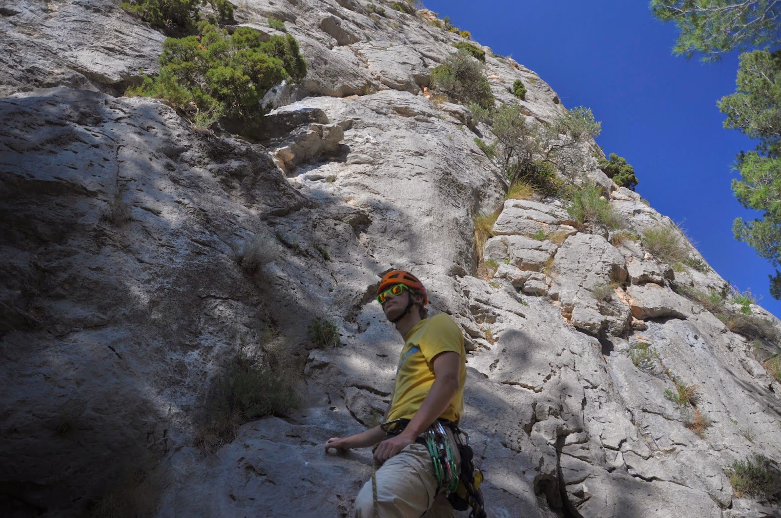Tiistaina päätettiin ryhtyä vähitellen ”kiristämään ruuvia”. Suunnattiin Sierra de Toixin alapuolelle tavoitteena löytää Pirates of Caribbean luola netistä löytyneen topon avulla. Reitti kuvaus oli suuntaa antava, mutta annettu suunta ei oikein auennut meille. Kapusimme ensin korkealle meren yläpuolelle kalliolle ja aloimme arpoa, että mitä merta kohti jyrkästi viettävää kurua meidän pitäisikään päästä rantakallioiden päällä olevalle tasanteelle. Arvoimme oikeata kurua ja kävelimme edes takaisin jyrkässä kivikossa aikamme, mutta lopputulos oli huono. Ei löydetty mielestämme sopivaa reittiä alas. Pirates of Caribbean olisi ollut 60 metriä korkea luola rantakalliossa, jonne laskeudutaan luolan katossa olevasta reiästä ja sieltä sitten kolme köydenpituutta ylös samaan aukkoon. Tämä jäi nyt kokematta, mutta ehkä ensi kerralla. Vetäistiin muutama sopiva reitti paluumatkalla TV-sektorin Tropical Dreams osiolla ja palattiin Alteaan.