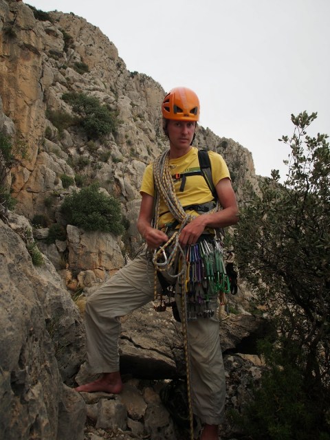 No, oliko päivä vedetty läpi ”kunnolla”? Itselle nämä reitit on se harrastuksen suola ja olisi mukava kehittyä pikku hiljaa. Mitään suurempaa sählinkiä ei sattunut. Kerran käydet vähän solmussa, mutta se oli aika pientä. Kiivettiin yhdellä kymppilitraisella repulla joten oli aika kevyet kamat, mutta kaikki tarpeellinen oli ja lämmintä vaatetta ylikin. Vettä olisi mahtunut mukaan ainakin yksi pullo lisää, mutta toisaalta reissun venyminen taisi olla enemmän syynä sen loppumiseen. Jos jotain haluaisi tehdä enemmän kunnolla, niin se olisi aikaisempi lähtö viileämpään aikaan, joka näillä seuduilla toki pohjoisen miehelle on aina miellyttävämpää. Kevyiden kamojen lisäksi räkki oli tehokas. Kaikkia kamoja tuli käytettyä tasaisesti eikä turhaa rautaa ollut mukana. Ehkä pari pidennettävää jatkoa enemmän, mutta niitä ei tälle reissulle tullut edes montaa otettua. Kaiken kaikkiaan hyvää menoa.