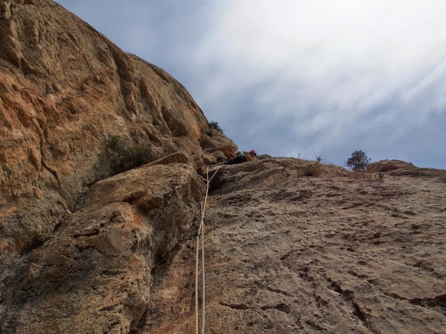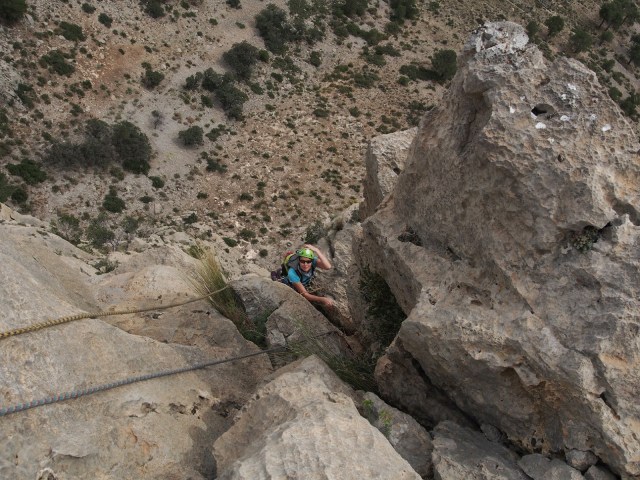 Topissa oltiin joskus neljän jälkeen joka on tietysti aika paljon kun ajattelee pimeän tuloa joskus kasin ysin välillä. Topossakin varoiteltiin useampaan otteeseen laskeutumisen epäselvyyksistä varsinkin piemeällä. Arvioitiin kuitenkin pystyvämme vetämään loput neljä pätkää ja laskeutumisen päivänvalolla. Samoin kokeneemman britin kommentit ainoasta oikeasta tavasta kiivetä kannustivat jatkamaan. Näin Laura lähti etsiskelemään reittiä ylöspäin. Ensimmäinen kp yläankkurilta vaatii vielä vähän haeskelua kunnes löytää harjanteen.