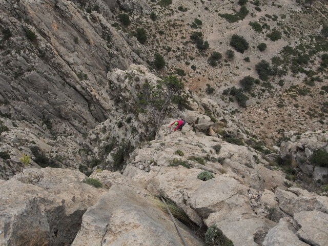Meille Rockfaxin toposta löytyi top50 reitti Diedros Mágicos. Varsinainen reitti on viisi köyttä (5, 5, 5+, 4+, 6a), josta voi halutessaan jatkaa pääharjanteelle neljällä helpolla köydenmitalla. Kiipeäminen on koko matkalta laadukasta ja suht tasaista vaikeustasoa paitsi yllättävänkin tiukka viimeinen 50 metrinen 6a. Maasta käsin ei tajua miten jyrkkää meno välillä on ja varsinkin viimeinen pitkä kruxiköydenpituus on todella jyrkkää menoa pienten kattojen yli. Ständit ovat hyvin ilmavia ja näkymät ovat komeat. Suosittelen myös jatkamaan harjannetta toppiin asti. Reitti on ylös asti suht selkeä ja eksymään ei pääse. Ankkurit on pultattu neljällä ensimmäisellä ständillä ja viimeisellä on blokiin kiedotut nartsat. Ylempänä on omillaan, vaikka jotain yksittäisiä naruja näkyi siellä täällä. Kiipeäminen lähtee noin 800 metristä ja päättyy reiluun 1100:aan, josta noin puolet on varsinaista reittiä ja puolet lisäköydenpituuksia.