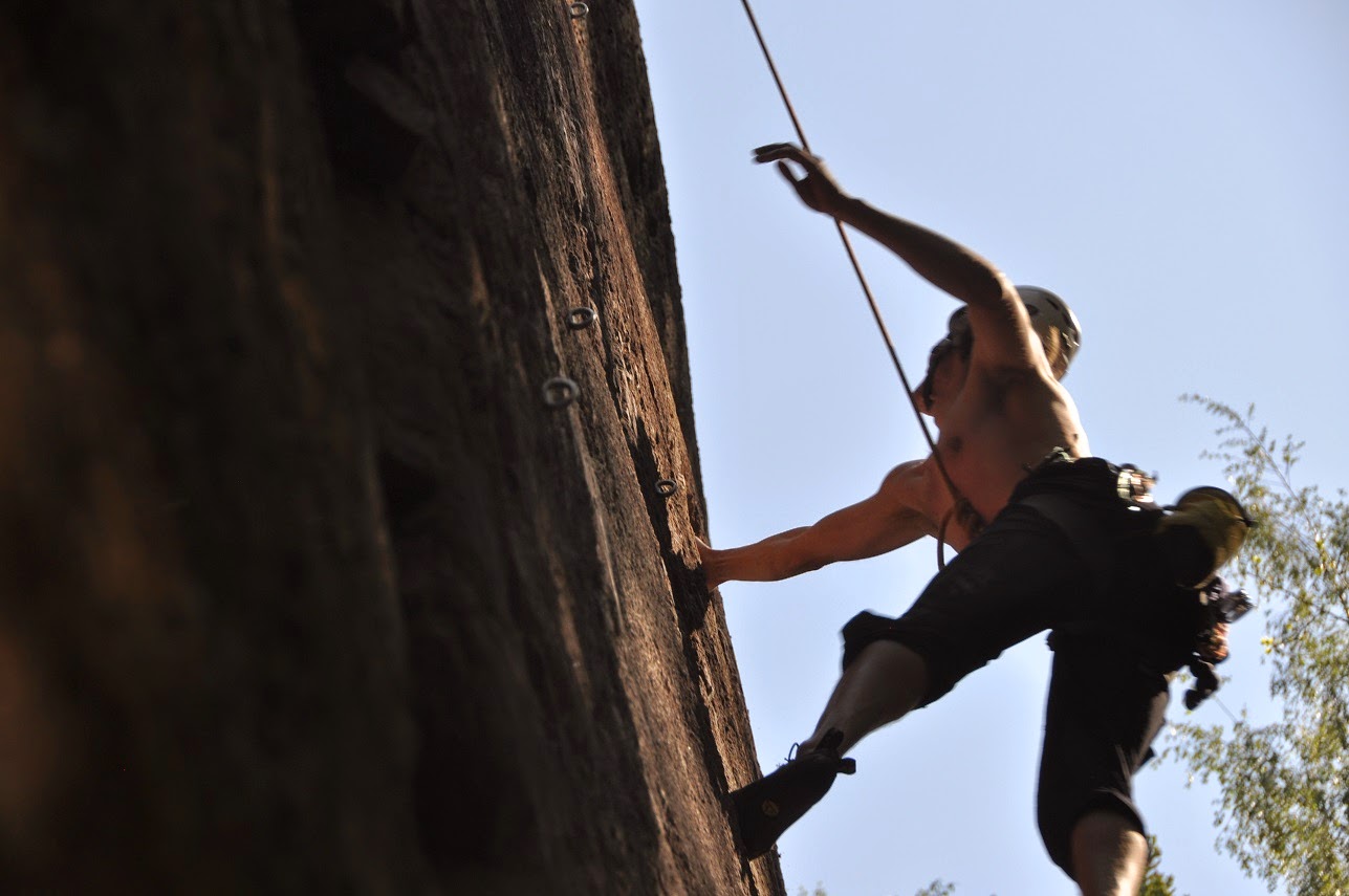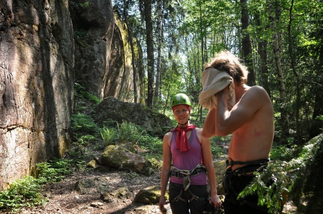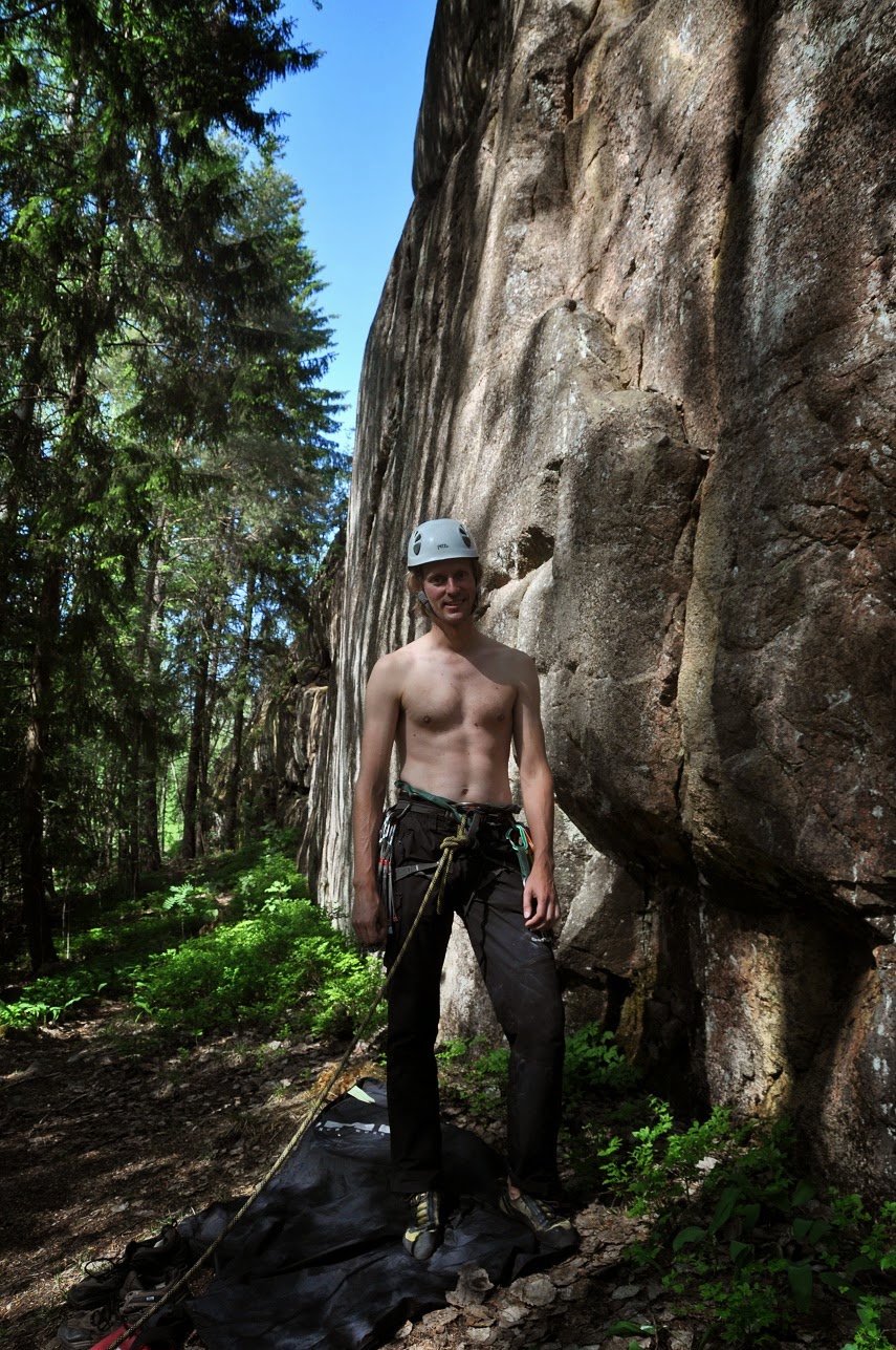 Viikonloppu oli aivan käsittämättömän lämmin. Mankat oli luonnollisesti vähissä ja seinällä puski soijaa. Silti kiipeily sujuu kauden alkuun nähden ihan ok. Olisiko Espanja sittenkin auttanut, vaikka meno tuntui siellä niin erilaiselta. Graniittiin on päässyt totuttelemaan jonkin verran, mutta on se silti vielä vähän hakusessa. Ja ei tässä voi mistään tason nostosta vielä puhua. Oma liidaaminen on vielä tukkoista ja epämukavuusrajan ylittäminen on aika harvassa. Ainekset olisi kuitenkin olemassa kunhan pääsisi jatkamaan oikeilla liikkeillä. Ensinnäkin duuneja ei pitäisi päästää haittaamaan harrastuksia niin paljon kuin nyt ja toiseksi täytyisi uskaltaa huomattavasti enemmän. Mennä sinne kiipeilyn vaikeammalle puolelle.