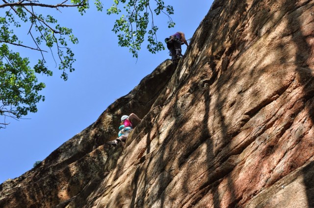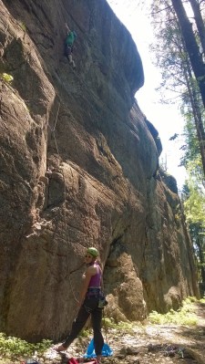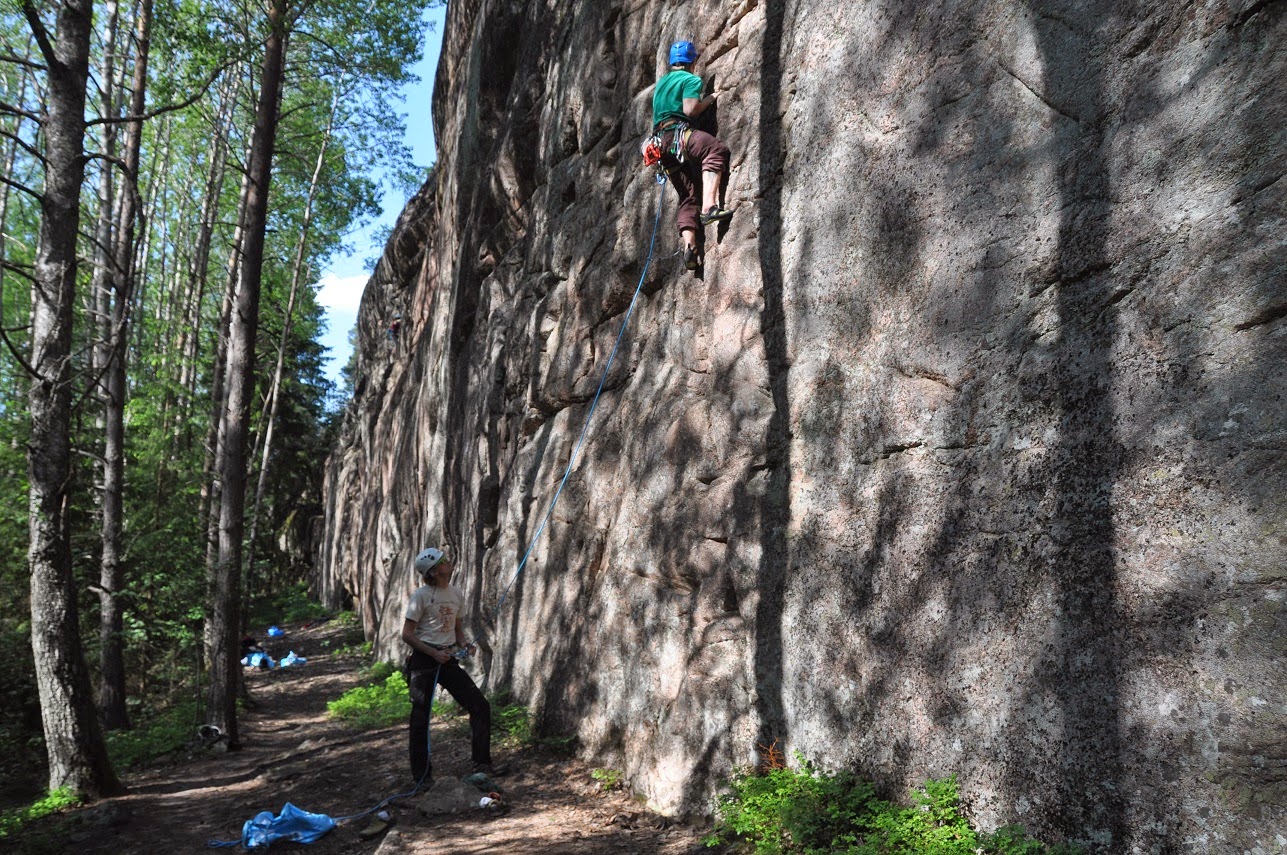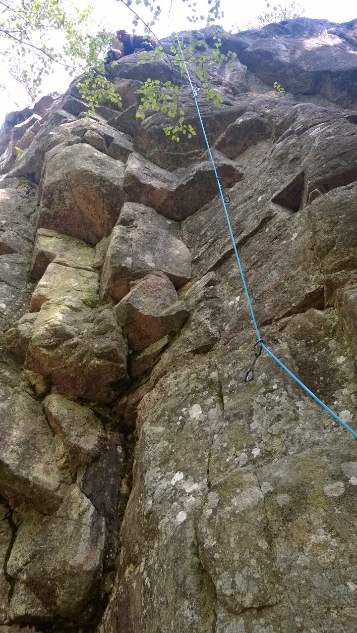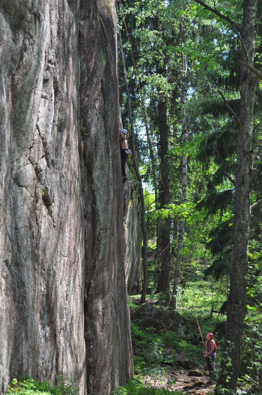 | Jo ensimmäinen ”vitosen lämppäri” oli ihan tarpeeksi jännä. Silti hyvää kiipeämistä ja varsinkin yliksellä sai nopeasti niitä tässä vaiheessa kautta niin tärkeitä metrejä. Jukka painaa menmään, Laura varmistaa. |