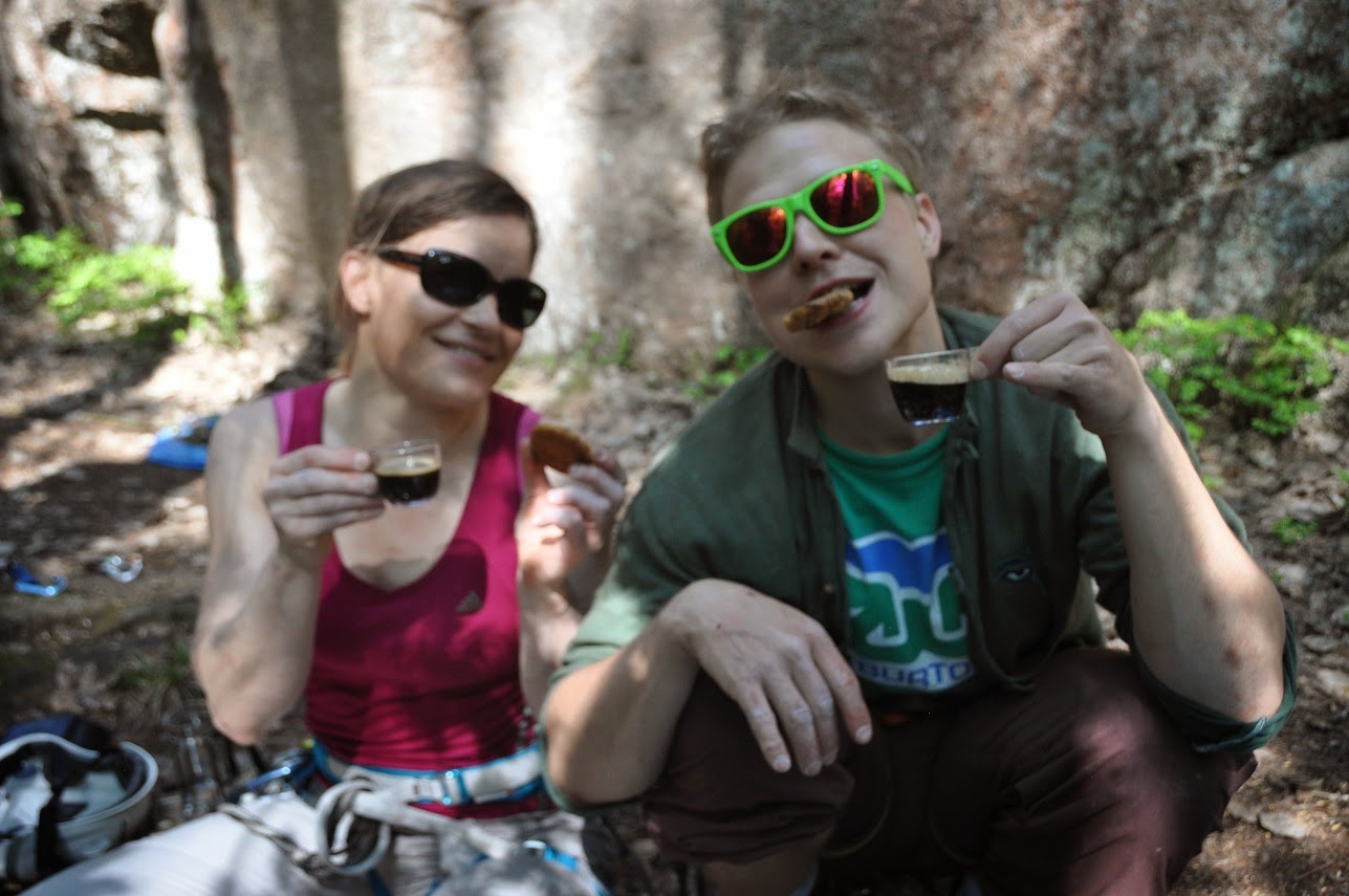 | Nina ja Jukka herkuttelemassa. Espresso oli laadukasta ja kiipeilykeksit hyviä. Jos ei muuta viidessä vuodessa ole lajista oppinut, niin ainakin sohloilla on selvä kuva mikä on hyvää ja laadukasta nautiskelua kiipeilyn lomassa. |