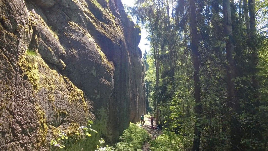 | Hyttyskallio on jatkuva ja sen tuntee monella reitillä. Kerrankin tarpeeksi kuiva, jotta keli suosisi tässä pusikossa enemmän kiipeilijää kuin hyttystä. |