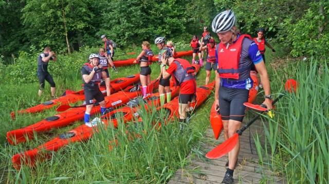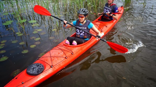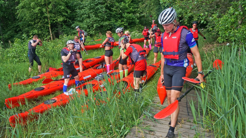No Limit alkoi 1,5 kilometrin prologilla, jonka aikana tuli suorittaa 1,5km bike&run läheisellä pururadalla. Mikko sai kunnian ottaa ensimmäisen juoksuvuoron, eikä lopulta edes suostunut vaihtamaan rooleja päittäin myöhemminkään. Minulle tuli siis helppo aloitus, joka tosin kostautui kun lähdettiin prologin jälkeen ensimmäiselle pyöräilyosuudelle. Oli ihmeen heikko olo, ja alkoi jo epäilyttää eikö edellisen illan pasta- ja aamun puurotankkaus riittäneetkään edes auttavasti paikkaamaan kuluneen viikon heikohkoa syömistä. Päästiin onneksi pian melomaan, ja reilun tunnin läpsyttelyn aikana lihakset lämpenivät ja hutaisin varmuuden vuoksi myös puolikkaan energiapatukan seuraavan pyöräilypätkän menoa siivittämään.