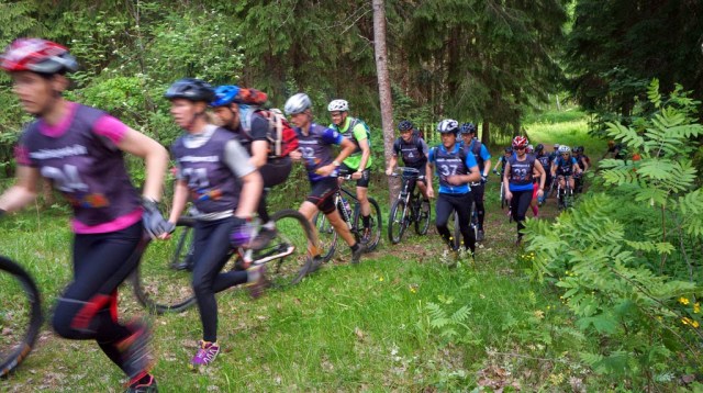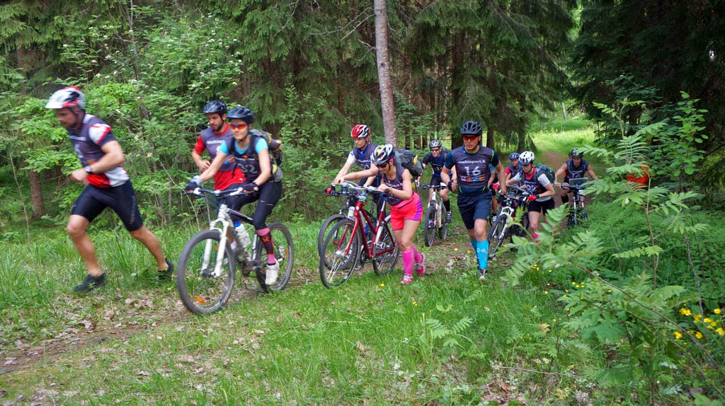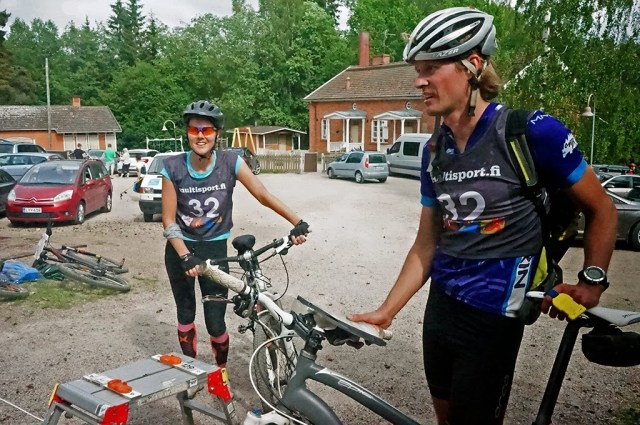 Quest ja enduro-rata söivät voimia aika tehokkaasti, ja seuraavalla pyöräsiirtymällä alkoi vatsa murista siihen malliin että tankkaus oli jo vahvasti retuperällä. Yritin nopeasti korjailla tilannetta geelillä, sillä ajatus oli että rullaluistimien puuttuessa suorittaisimme seuraavan rullisteluosuuden bike&run-tyylillä. Sattui kuitenkin niin onnekkaasti, että kilpailun säännöt sallivat kahden henkilön ahtautumisen yhden pyörän päälle ja tätä ratkaisua tietysti nopeusedun takia lähdettiin yrittämään. Alkujäkityksen jälkeen matka rullaluistelurastilta toiselle taittui mukavasti etutangolla istuen, ja sain myös arvokkaan lepohetken hieman palautella voimia.