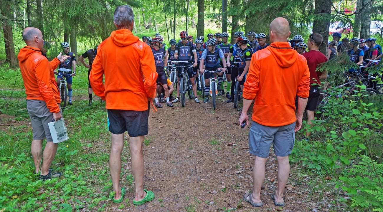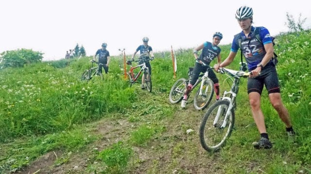 Syystä taikka toisesta alkoi pyöräily melonnan jälkeen taas sujumaan, ja saatiin kaikki rastit sujuvasti haettua. Ensimmäinen quest oli Vihdin laskettelukeskuksen rinteessä, jossa tehtävänä oli ajaa/taluttaa kahdesti rinteeseen rakennettu pujottelurata alas ja polkea/taluttaa se takaisin ylös. Suosin itse olosuhteiden pakosta tuota jälkimmäistä vaihtoehtoa, eli juoksin pyörän kanssa alas ja talutin sen takaisin ylös. Ruohikkoinen rinne oli ensimmäisten joukkueiden alla muuttunut varsin liukkaaksi, ja varsinkin alastulo oli epävarman maatuntuman takia aika nihkeän tuntuista. Ylösmeno taisi olla enemmän voimista kuin maastosta kiinni, sillä pääsimme todistamaan myös Mäkelän veljesten tyylinäytettä rinteen polkemisesta alhaalta ylös asti. Ei voinut kuin nostaa herroille hattua, sillä tekemisen meininki oli suorastaa käsin kosketeltava. Questin jälkeen ehti juuri ottaa siirtymällä pari huikkaa vettä ennen enduro-radan muodossa heitettyä seuraavaa haastetta. Uskoisin että kokeneet maastopyöräilijät olivat radasta ihan fiiliksissään, mutta itselläni oli välillä aika toivoton olo kun ei vaan osannut. Liian isoja kiviä ja liian isoja kuoppia, mutta jotenkin niistäkin taas yli selvittiin vaikka aika monessa kohtaa joutui nöyrästi vaan jalkautumaan.
