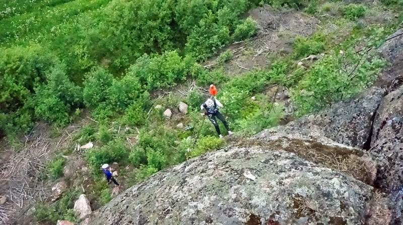 Rullaluistelun jälkeen oli pyöräsuunnistus jo voiton puolella, ja loput rastit johdattelivat meidät seuraavalle questille ja juoksusuunnistuksen alkuun. Jo questille lähestyessä alkoi mustia pilviä kasaantua kisasuorituksen taivaalle, sillä alue oli perinteistä hakkuuryteikköä sinnikkäällä hyttysarmeijalla höystettynä. Questi sujui kyllä hyvin, sillä tehtävänä oli Kiipeilysohlojen peruskauraa eli köysiaskeutuminen kalliolta. Mikolla taisi hetkeksi jäädä kiipeilyvaihde päälle vielä laskeutumisen jälkeenkin, sillä hetken aikaa etenimme vaikeinta eikä helpointa reittiä ja teimme myös kunniakierroksen quest-kallion ympäri. Tästä eteenpäin suunnistus gps-jäljen perusteella sujui kuin Jukolassa konsanaan, ja rastilta mentiin suoraan seuraavalle ilman ylimääräisiä lenkkejä. Suora eteneminen tässä maastossa tosin tarkoitti jatkuvaa puskemista milloin minkäkin ryteikön läpi, pyöräilykypäräkin oli kerrankin todella tarpeen myös juoksusuunnistuksessa.