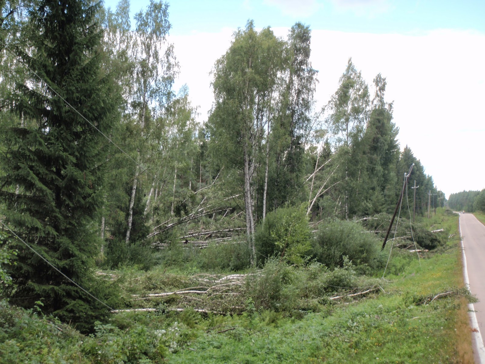 Ukkosmyrskyn jäljiltä Vuohijärvellä oli puuta laossa ja sähkölangat maissa.