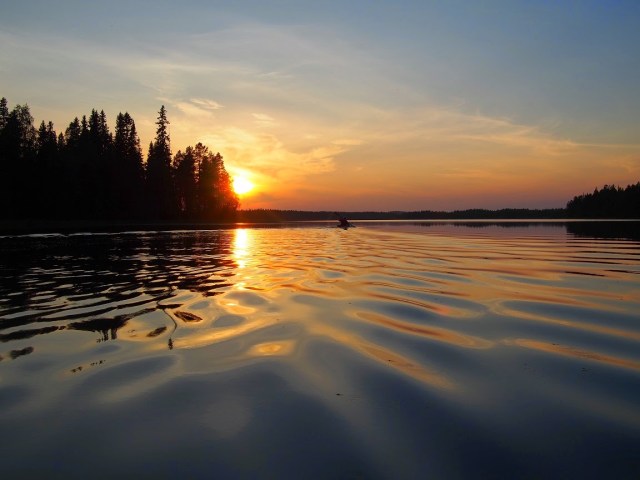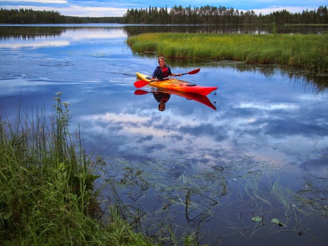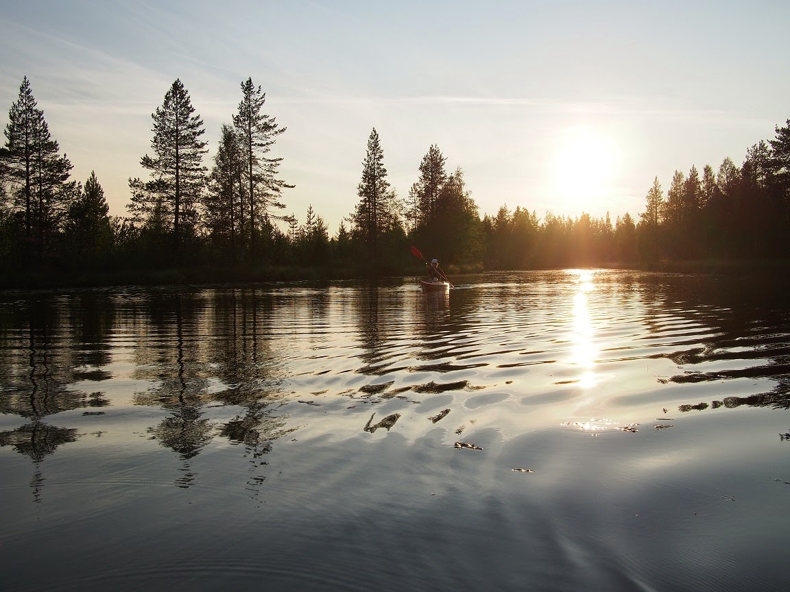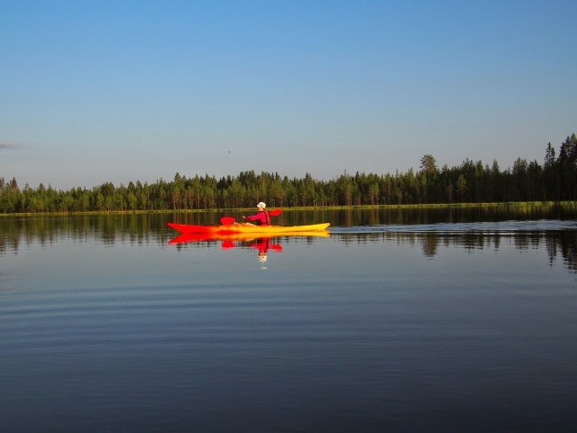 | Pelkästään Kellojärvelläkin meloessa pääsee kajakista käsin nauttimaan hienoista iltavaloista. |