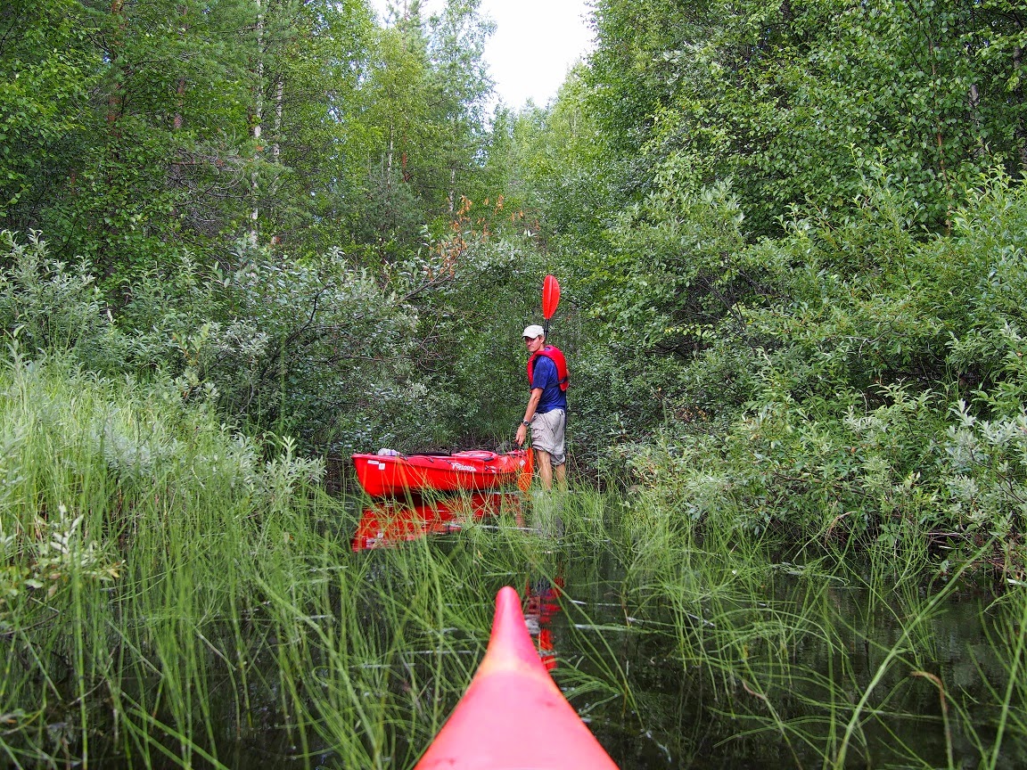 | Joki pienenee aika äkkiä suota eteenpäin kulkiessa. Lopulta ei pääse vedessä kääntymään eikä edes mahdu melomaan. |