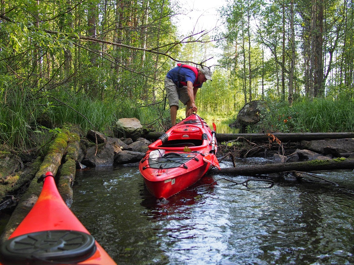 | Hieman pidemmällä tuli vastaan pari kapeaa ja kivikkoista pätkää. Tässä nostellaan niistä toisessa kajakkeja tukkien yli – kyseessä on todennäköisesti vanha uittopuomi niiltä ajoilta kun jokea käytettiin tukinuittoon. |
