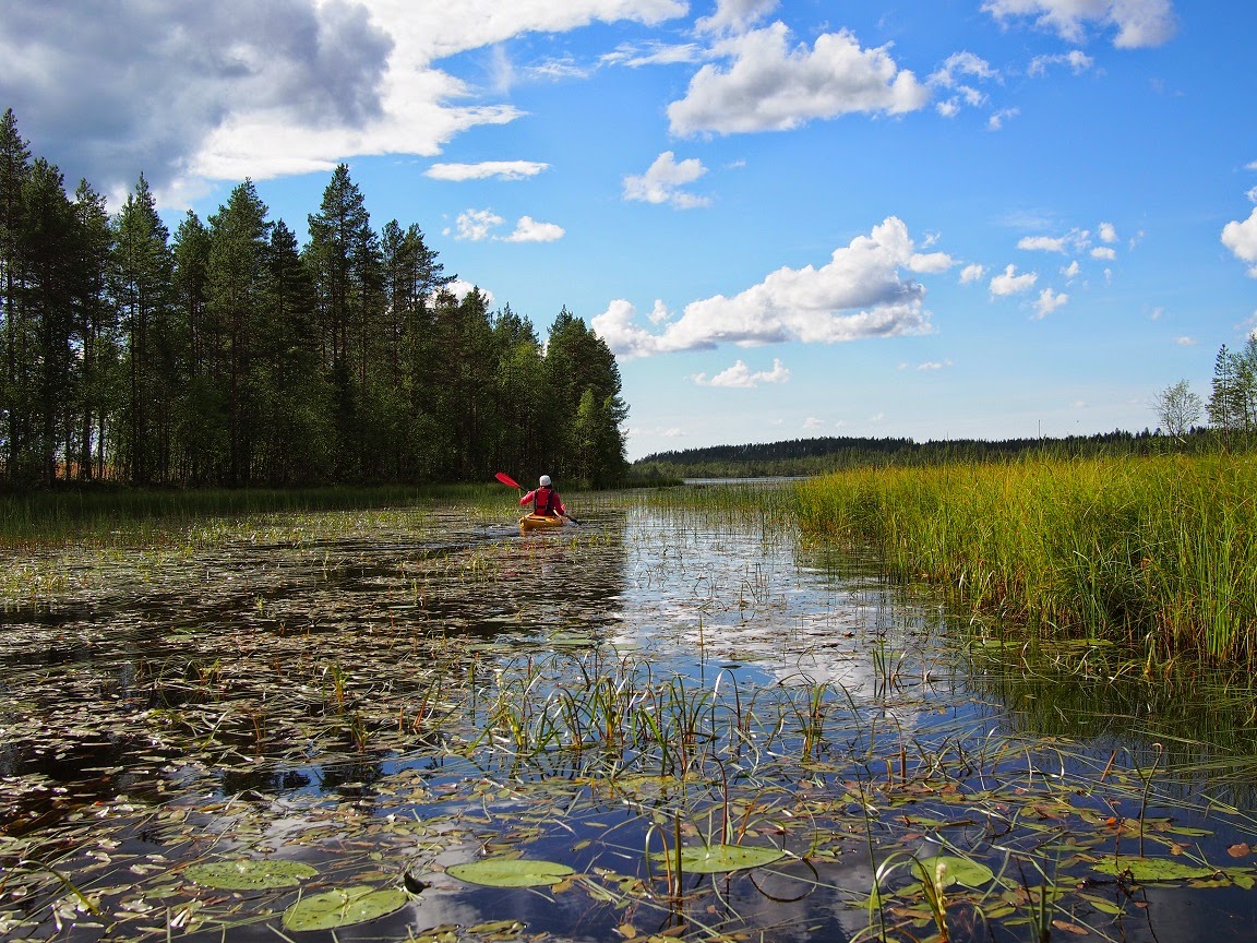 Perjantai piti olla vielä työpäivä, mutta kun ilmeisesti koko Pohjois-Suomussalmi oli pimeänä ei tarvinnut istua läppärin edessä. Niinpä lähdettiin iltapäivästä kartoittamaan reittiä. Soutuveneellä ei pääse pitkälle Kellojärven selältä kun jo ensimmäinen lahdenpoukama on liian sankkaa ruovikkoa, mutta meillä oli tiedossa reitti suuren ruovikon läpi. Reittiä joutui vähän hakemaan ja yhdessä kohdassa nyhtämään kajakkia kymmenisen metriä kortteista, mutta pienien vesi lämpäreiden kautta pääsi Kellojoen suulle nättiin paikkaan. Pikku-Kellojärvi tuli äkkiä vastaan pienen joenpätkän jälkeen.