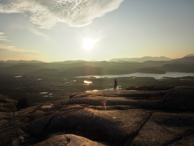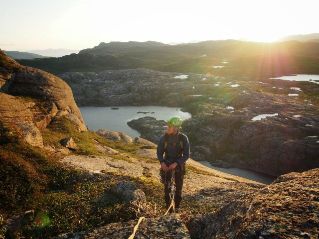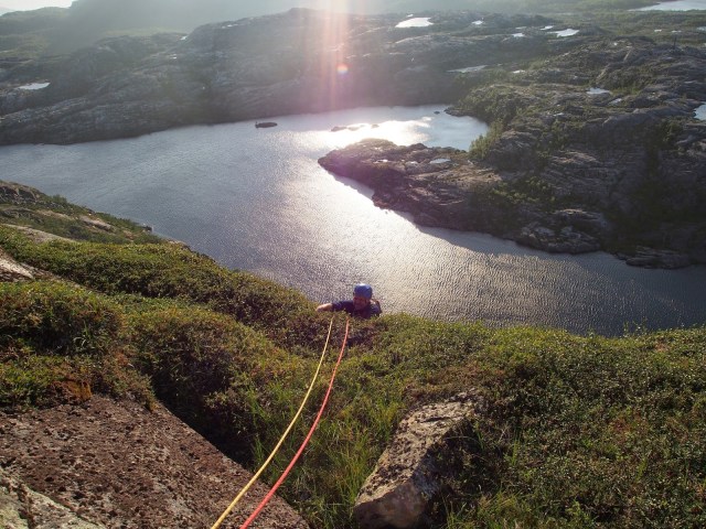 Store Veggenillä kiivettiin sekä paikan varmaankin suosituin reitti Senterlinje ja sen vierestä löytyvä Rena Döden. Kumpikin on greidiltää 5+:aa ja pääosin hyvinkin letkeää menoa. Senterlinjalla on lisäksi pulttiankkurit ja yllättävän paljon pultteja norjalaisen mittapuun mukaan. Reitillä on yksi A0 halkeamasiirtymä köyden avulla tai vapaana 7-. Laura vetäisi sen kakkosena ilman mitään miettimisiä släbiä kun oli. Rena Döden on sitten enemmän norjaa. Mitään rautakamaa ei ole ja kun reitti on vähemmän kiivetty on kasvillisuuttakin enemmän. Lisäksi kolmas kp tuppaa topon mukaan olemaan märkä ja sitä se oli nytkin. Silti hyvää kiivettävää on paljon ja antaisin itse tähdet myös tälle linjalle norjalaisilla oletuksilla. Toppi on upea varsinkin ilta-auringossa ja sieltä pääsee näppärästi kävellen alas vaellusreittiä pitkin.