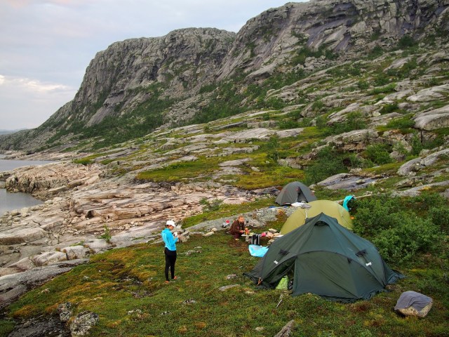 Etsittiin leiripaikkaa padon alla olevalta parkkipaikalta käsin. Kun oli tarkoituksena olla useampi yö, niin ei ihan auton viereen viitsitty laittaa telttoja vaan raahattiin ne patojärven rantaan. Virtaavaa vettä ei ihan heti polkua lähdettäessä löydetty, mutta muuten tilaa on. Retkeilijöitä tosiaan riittää, joten merkatulla polulla oli lähes joka aamu liikennettä.