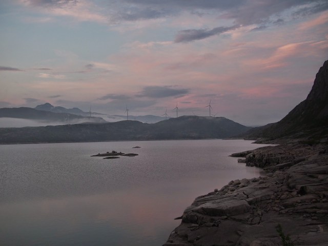 Nyt ajeltiin Tromssan kautta Narvikin seuduille monena vuonna välietapiksi suunnitellun Haugfjellin juurelle. Ideana oli hakea puuttuvaa kiipeilytuntumaa ja ajaa maastopyörillä. Teltat iskettiin pystyyn padon kupeeseen, josta oli moderni näkymä solan tuulimyllyille tyynenä iltapäivänä. Paikka osoittautui yllättäen suht tuuliseksi pari päivää myöhemmin. Padolta lähtee merkattu vaelluspolku Haugfjellin päälle, jota pitkin riitti kulkijoita – norjalaiset tykkäävät ulkoilla. Laaksossa on lisäksi norskien tunturimökkejä ja tietysti läpi paahtaa E10, jota pitkin liikkuu karavaanaria, rekkaa yms. Eli ihan ihmisten ilmoilla oltiin. Muuten seutu on karun kaunista kallioista tunturiylänköä ja kesän valot näyttävät komeilta.