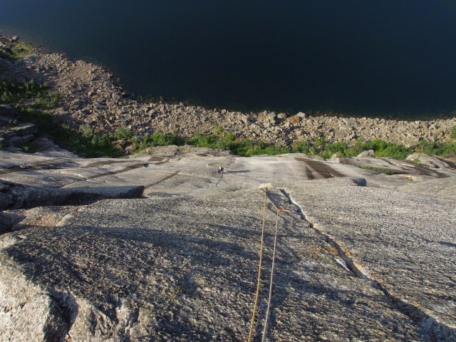 | Laura liidaa ensimmäistä pitkää reittiä ylös. Graniittia riittää. Senterlinja on varmaan kiivetyin reitti kalliolta. Se on hämmentävän hyvin pultattu norjalaiseksi reitiksi ja muodot ovat puhtaat kiipeilyn jäljiltä. |