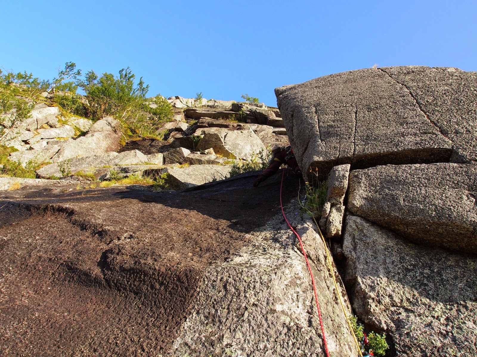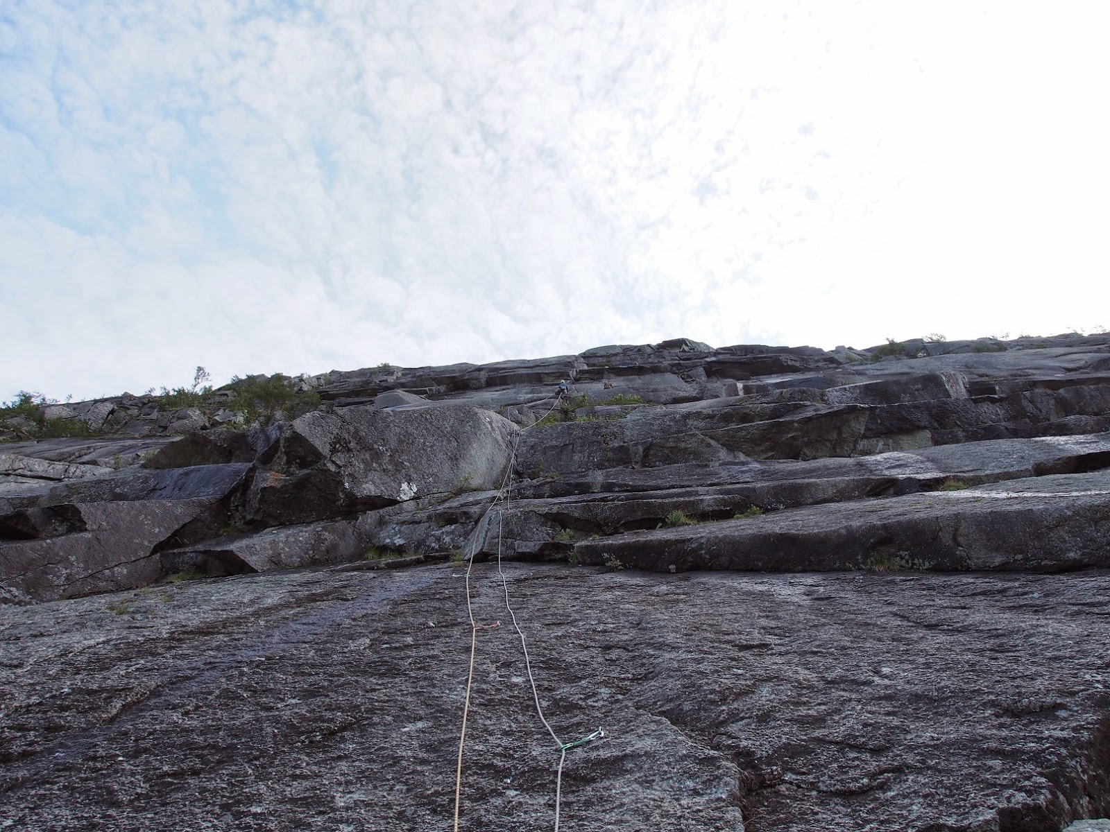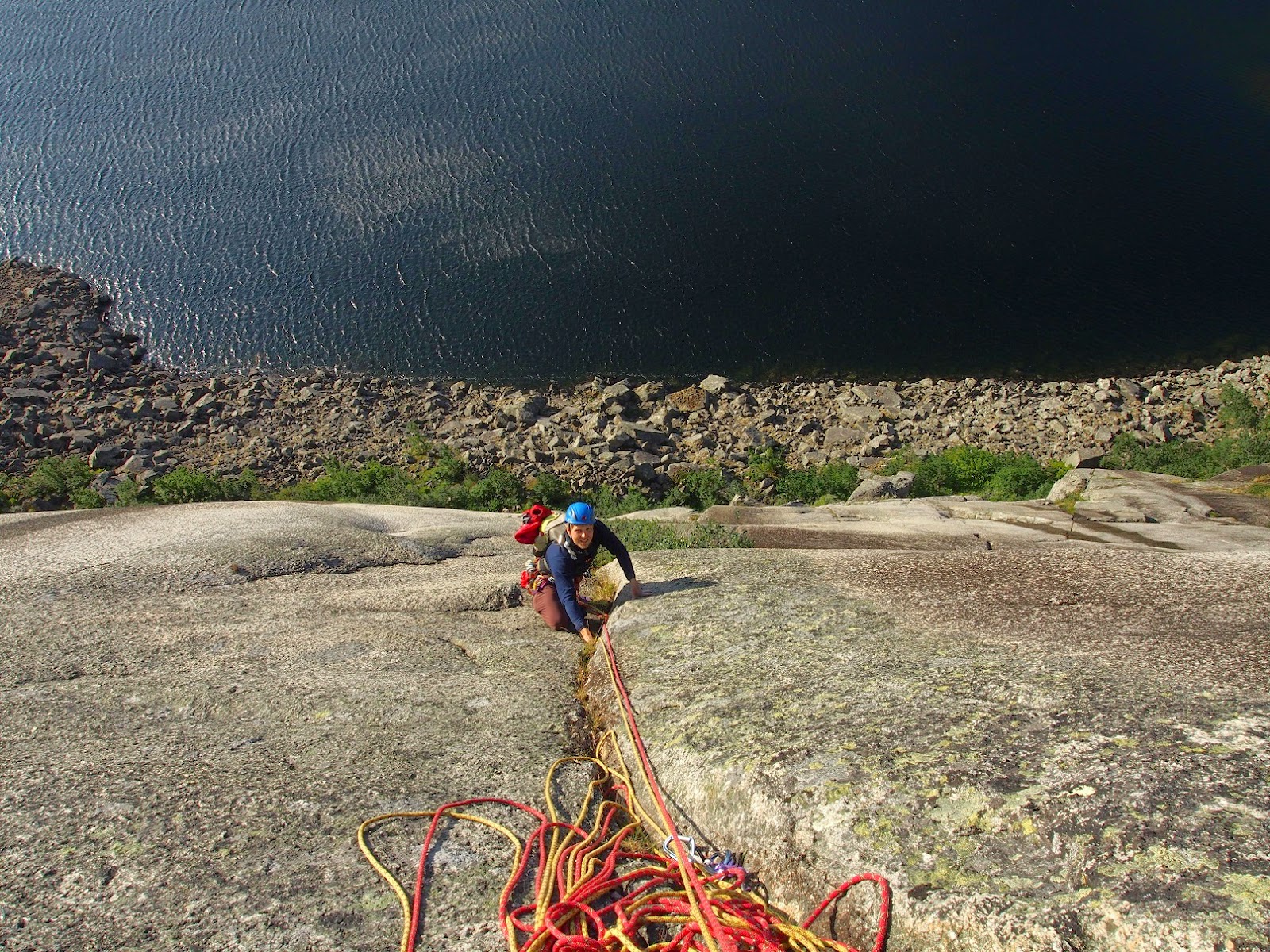 | Laura liidaa ensimmäistä pitkää reittiä ylös. Graniittia riittää. Senterlinja on varmaan kiivetyin reitti kalliolta. Se on hämmentävän hyvin pultattu norjalaiseksi reitiksi ja muodot ovat puhtaat kiipeilyn jäljiltä. |