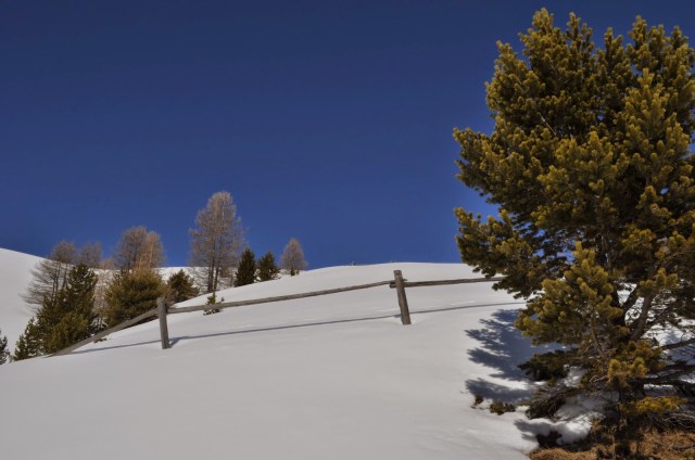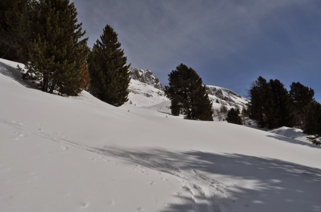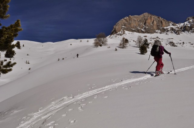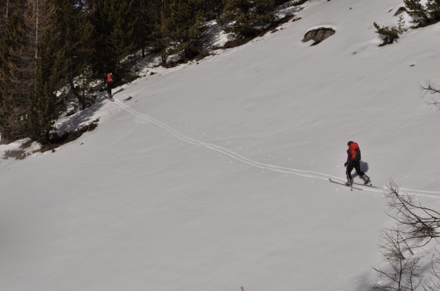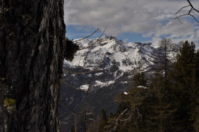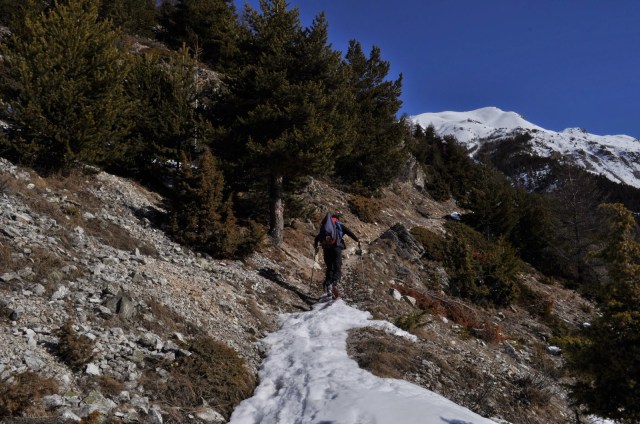 Tiistaiaamu avautui komeana. Aurinko helotti ja vuoret hehkuivat! Lähdimme nousemaan hiihtolatua ja myöhemin vaellusreittiä ylöspäin. Välillä mentiin polulla kapeaa lumivanaa seuraillen ja pikku pätkä jopa käveltiin täysin lumetonta vaellusreittiä. Ensimmäisen satulan jälkeen laskettiin erittäin hankala kuru ja siitä viereiseen metsään pitkää poikkaria vetämään. Metsässä pidettiin pikainen, mutta erittäin aurinkoinen lounastauko.