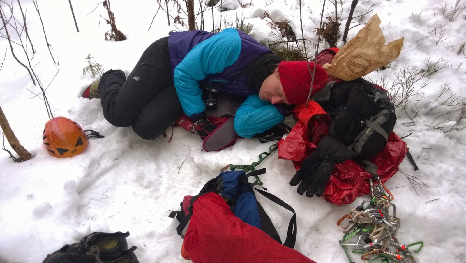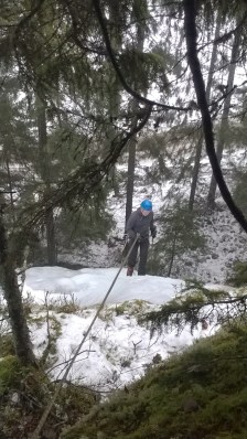 Tammikuun puolen välin paikkeilla, 17.1., jäät alkoivat taas olla aika heikossa hapessa, joten lähdettiin tutustumaan Nurmijärven Haukkaankalliolle, missä tarjolla on mixtaa ja draikkaa. Mikä tosin ei ollut kovin dry. Haukkaankallio tarjoaa hapottavat nousut. Mikä ei tosin ollut syynä kiipeilijän heikkoon oloon.