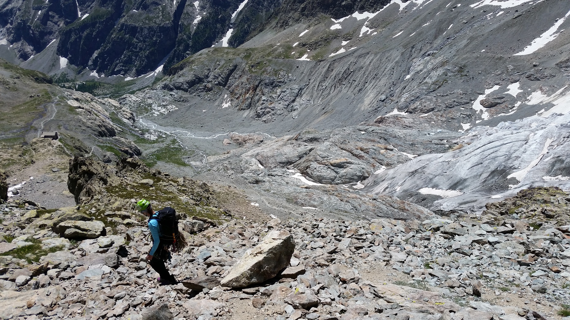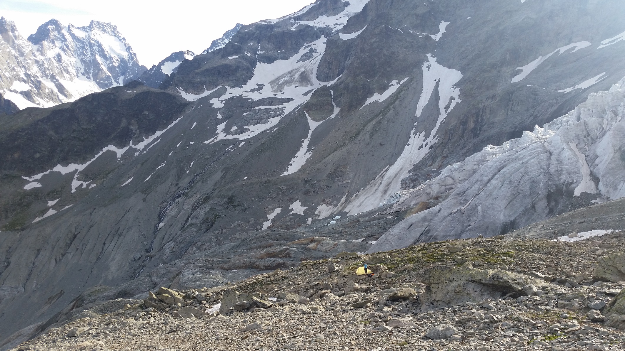 Otettiin tosiaan reissu treenin kannalta ja päätettiin kantaa mukana majoituskamat ja omat ruuat. Lisäksi otettiin varuiksi raudat ja hakut. Kantamista tuli siis paljon ja huomattavasti keveämmälläkin olisi selvinnyt kun melkein vieressä oli Refugio de Glacier Blanc. Käytännössä perus kalliokiipeilypäivän setti olisi ollut tarpeeksi. Nyt näytettiin ranskiksille mallia polulla raahamalla järjettömästi ylipakattuja reppuja. Ensimmäisenä päivänä hikoiltiin kuitenkin ylös parkkiksen 1850:stä telttapaikan 2650:een. Taisi olla se reissun kovin osa, mutta sopivalla vauhdilla ihan ok. Seuraavana päivänä sitten heti aamusta kiipeilyt (lähtö teltalta 8:30) ja laskeuduttiin takaisin kamajemmalle jo yhden maissa. Siitä sitten vielä takaisin autolle ja jopa ajeltiin aika pitkälle Italiaan vielä samana iltana. Eli todella nopea setti.
