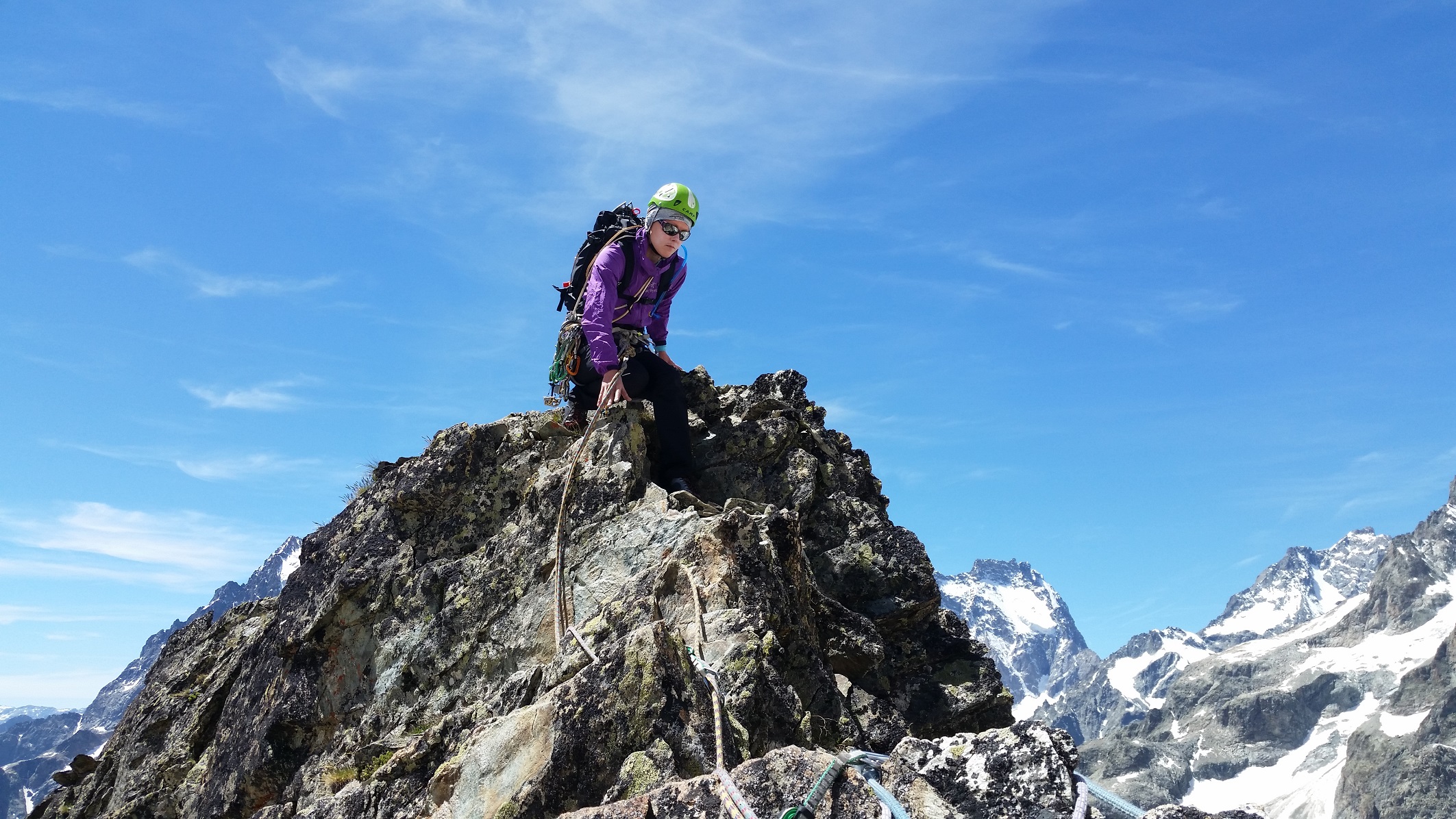 Kiipeily oli ensimmäisen kp:n osalta hyvinkin seikkailullista ja myös irtokiveä oli älytön määrä. Ehkä ei menty sitä kaikista kuljetuinta reittiä, koska ylempäinä oli jo siistimpää ja välillä tuli jopa jokunen pultti tai naru vastaan. Ei kuitenkaan mitään ihmeellistä mistä ei selvittäisi. Irtokivien lisäksi tietysti köysikitkaan täytyy kiinnittää huomiota ja kun vedettiin 55m köysiä välillä aika suoriksi niin myös kuuluvuus meinasi kadota. Keli oli kuitenkin optimi ja kun korkeus pikku hiljaa kohosi avautuivat näkymät entistä komeammiksi Glacier Blancin ylle. Harjanteella meno oli jo ilmavaa ja toppi oli oikea huippu vaikka vasta harjanteen alussa olikin. Kivaa menoa.
