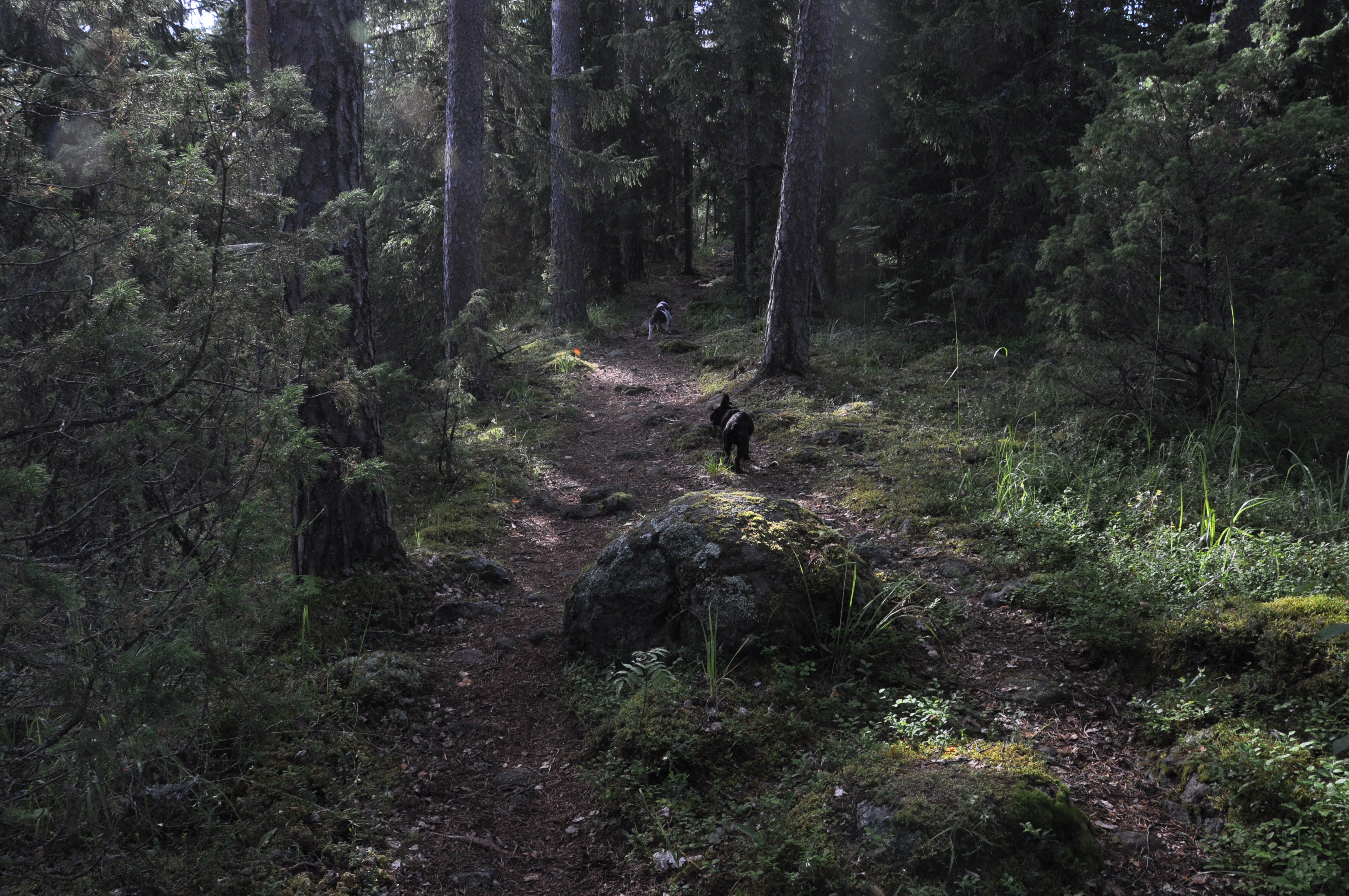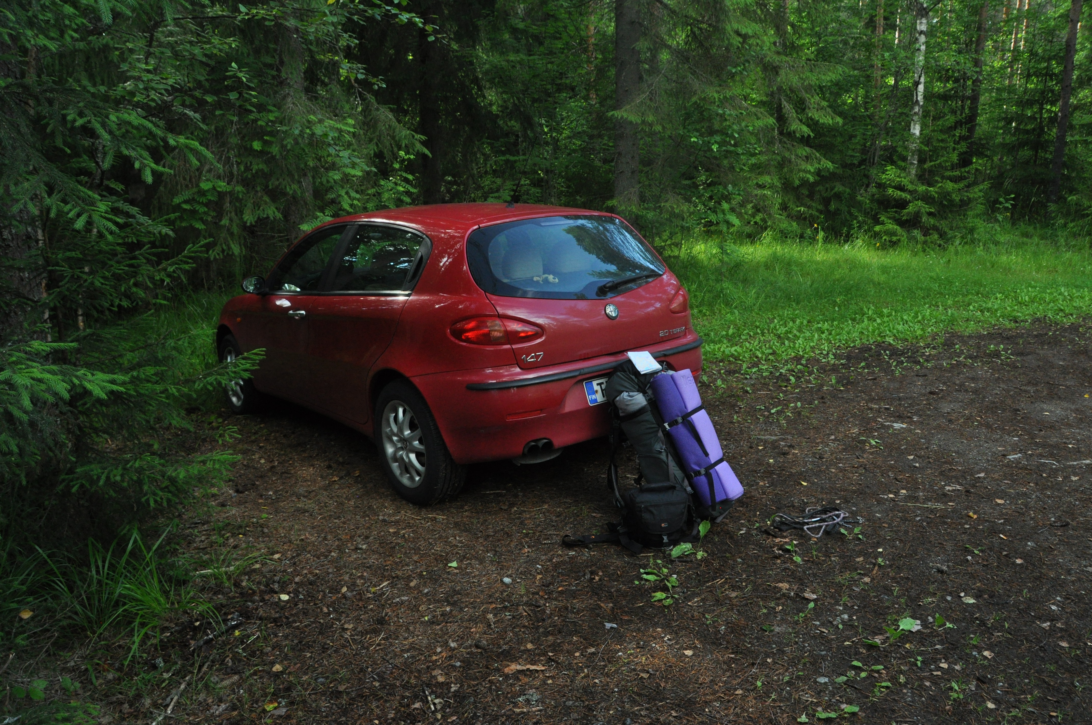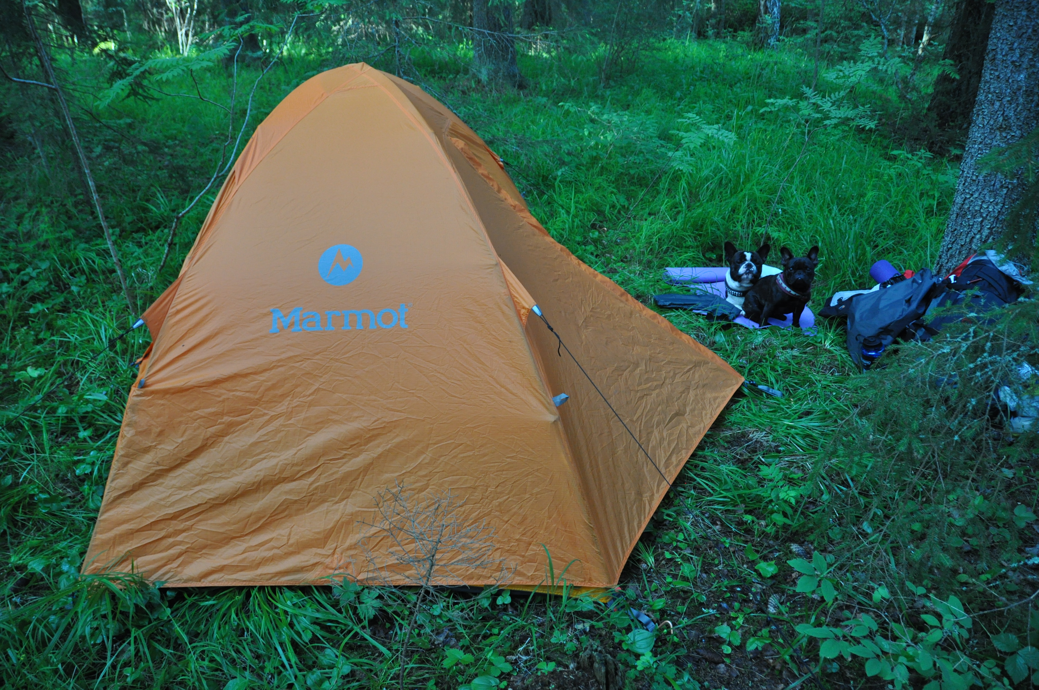 Minä lähdin tällä kertaa reissuun vain yhdeksi yöksi. Mukaan lähtivät Lulu ja Uuno ranskanbulldogit. Uuno on vanha retkeilijä, tai ei nyt niin hirveän vanha, vasta reilu pari vuotta, mutta Lululle tämä oli ensimmäinen telttayö ikinä. Lähdimme liikkeelle Syrjänalusen parkkipaikalta perjantai-iltana.