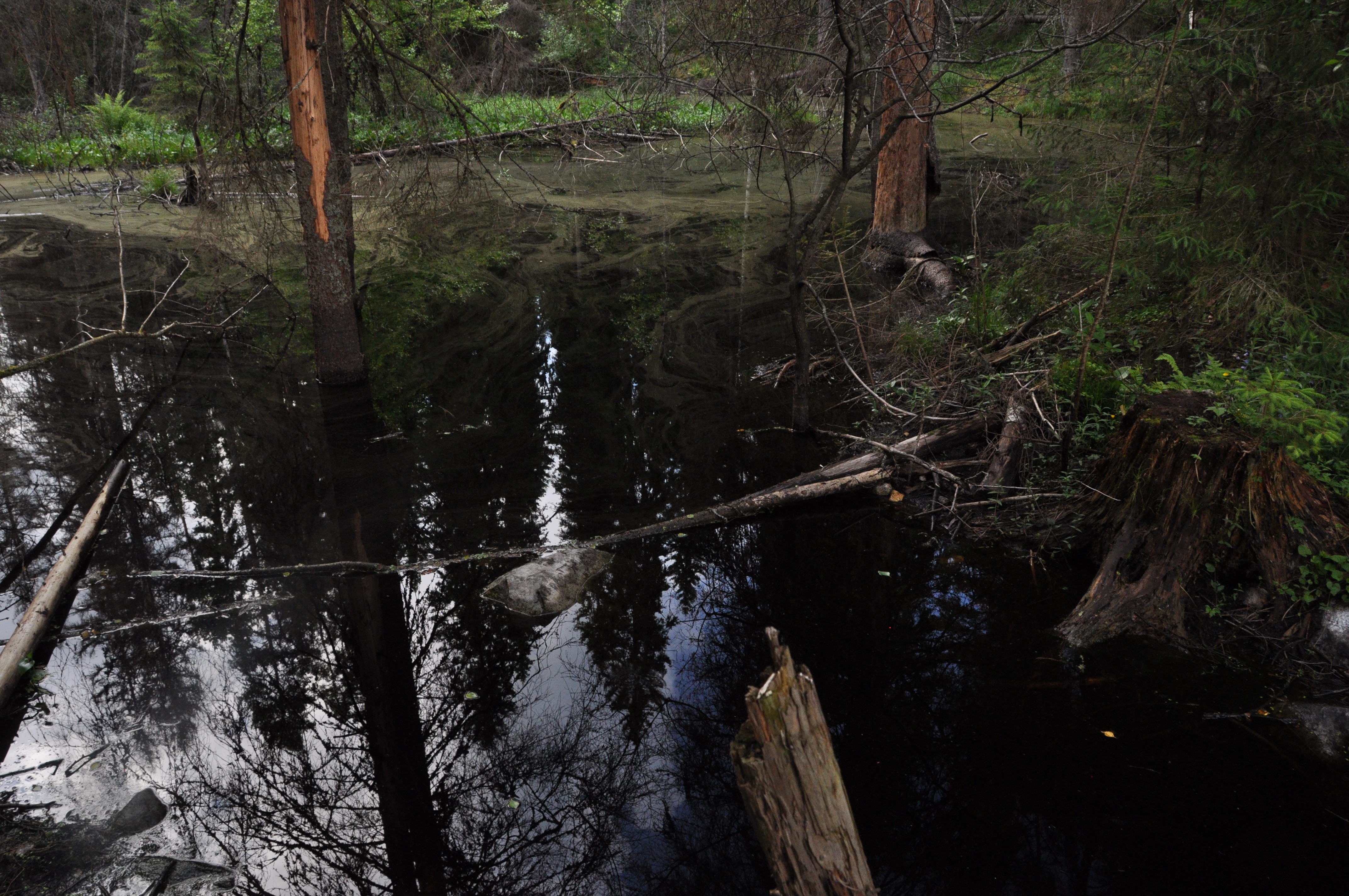 Mutta matka jatkui kohti komeata Harjupolkua, joka on merkattu luontopolku todella komeassa harjumaisemassa. Harjulta kun laskeuduttiin alas päästiin näkemään majavien tekeleitä tulvivan puron muodossa. Melko aavemaisen maiseman olivat majavat saaneet aikaiseksi.