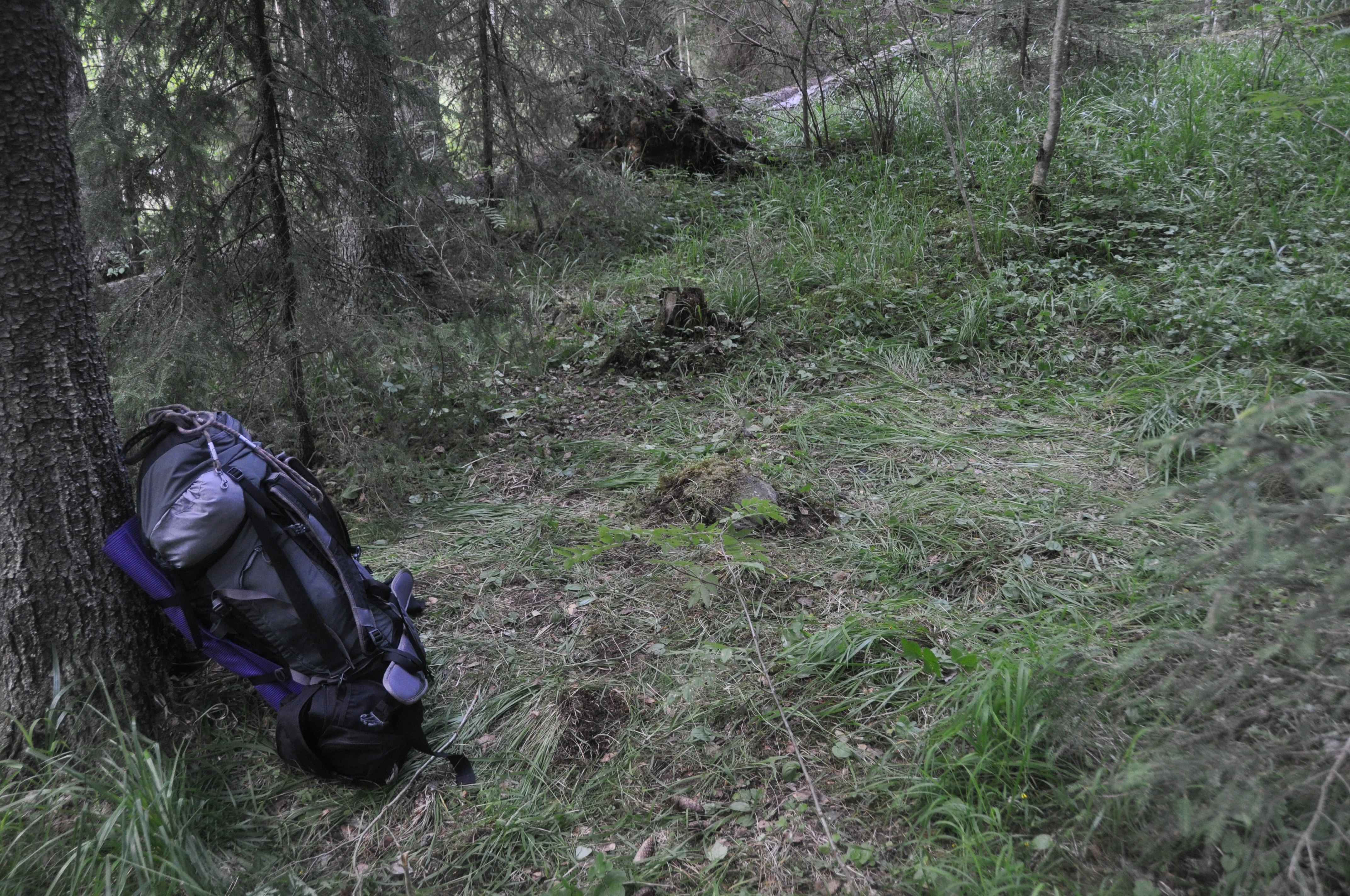 Jatkoimme eteenpäin vehreässä metsässä ja kun ilta alkoi saapua etsimme sopivan telttapaikan. Sitten vain teltta pystyyn ja ruuan laittoon. Olin varannut mukaan pikapolentaa, johon nappasin mukaan mausteeksi salamia, lihaliemikuution ja jotain epämääräistä mausteseosta kaapista. Ruoka oli sen verran maukasta, mutta simppeliä, että rupesin ihmettelemään, että miksi ihmeessä olen vuosia syönyt kamalan makuisia valmiita retkimuonapusseja!? En kyllä koske niihin enää ikinä…