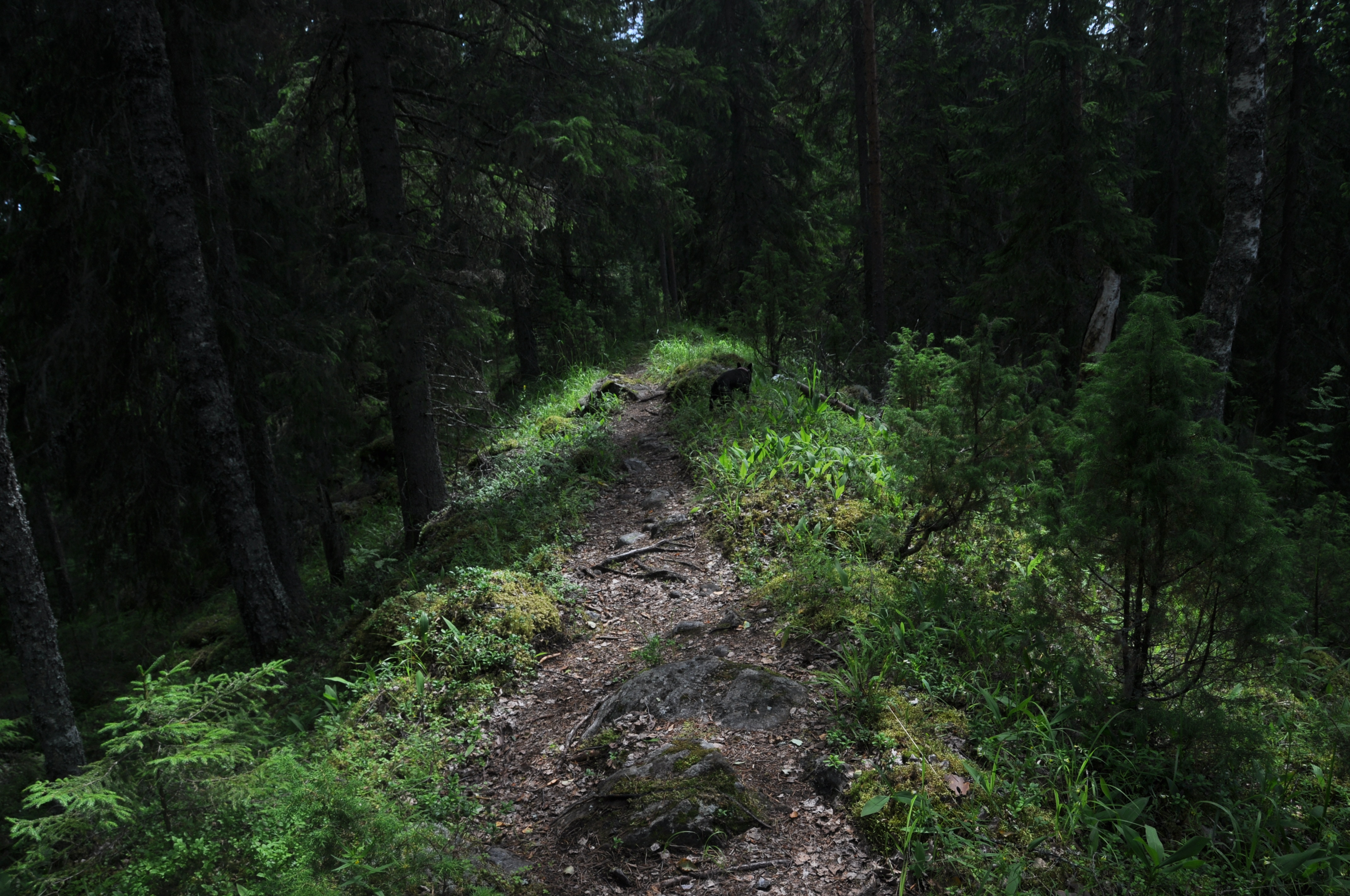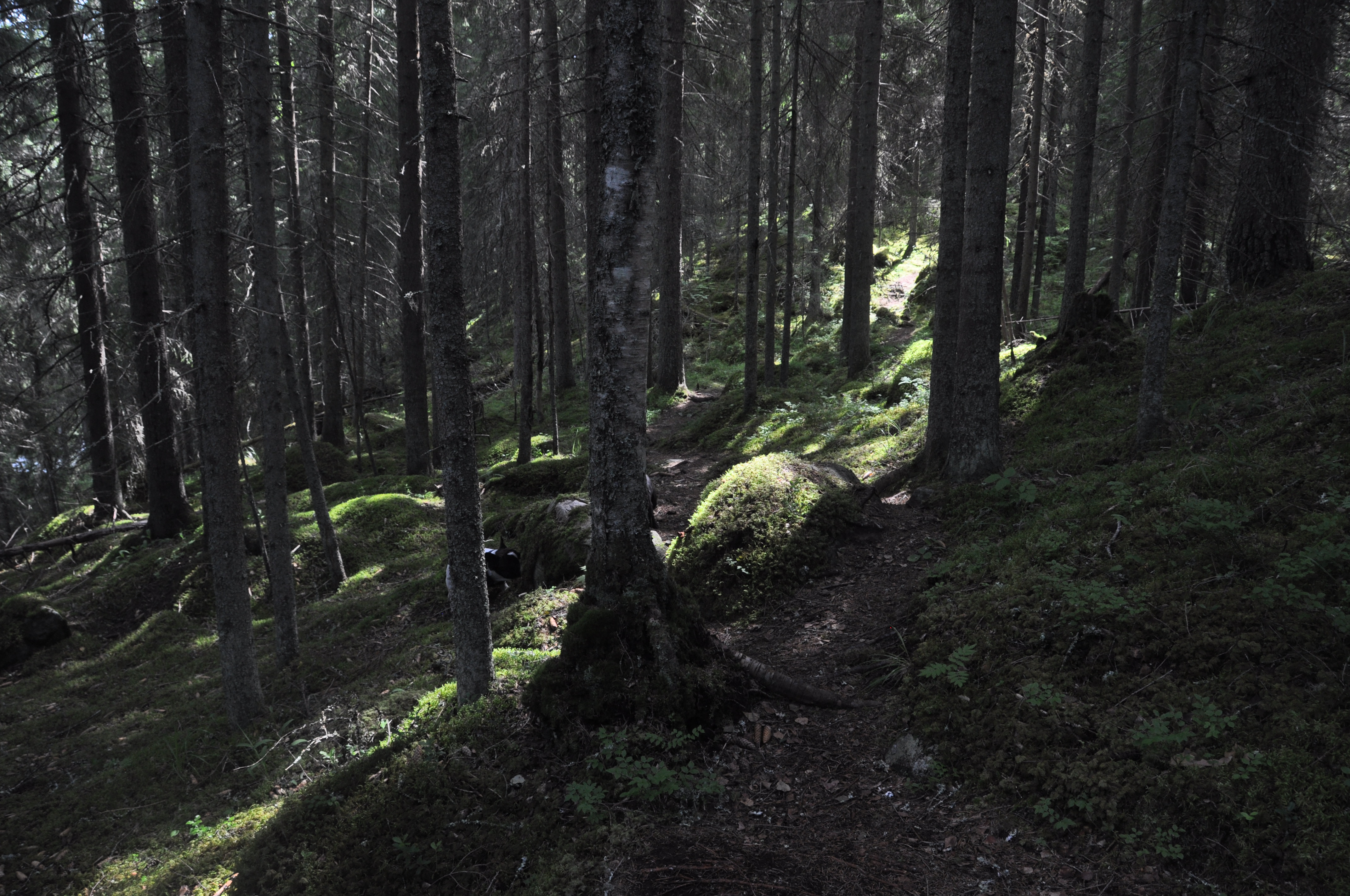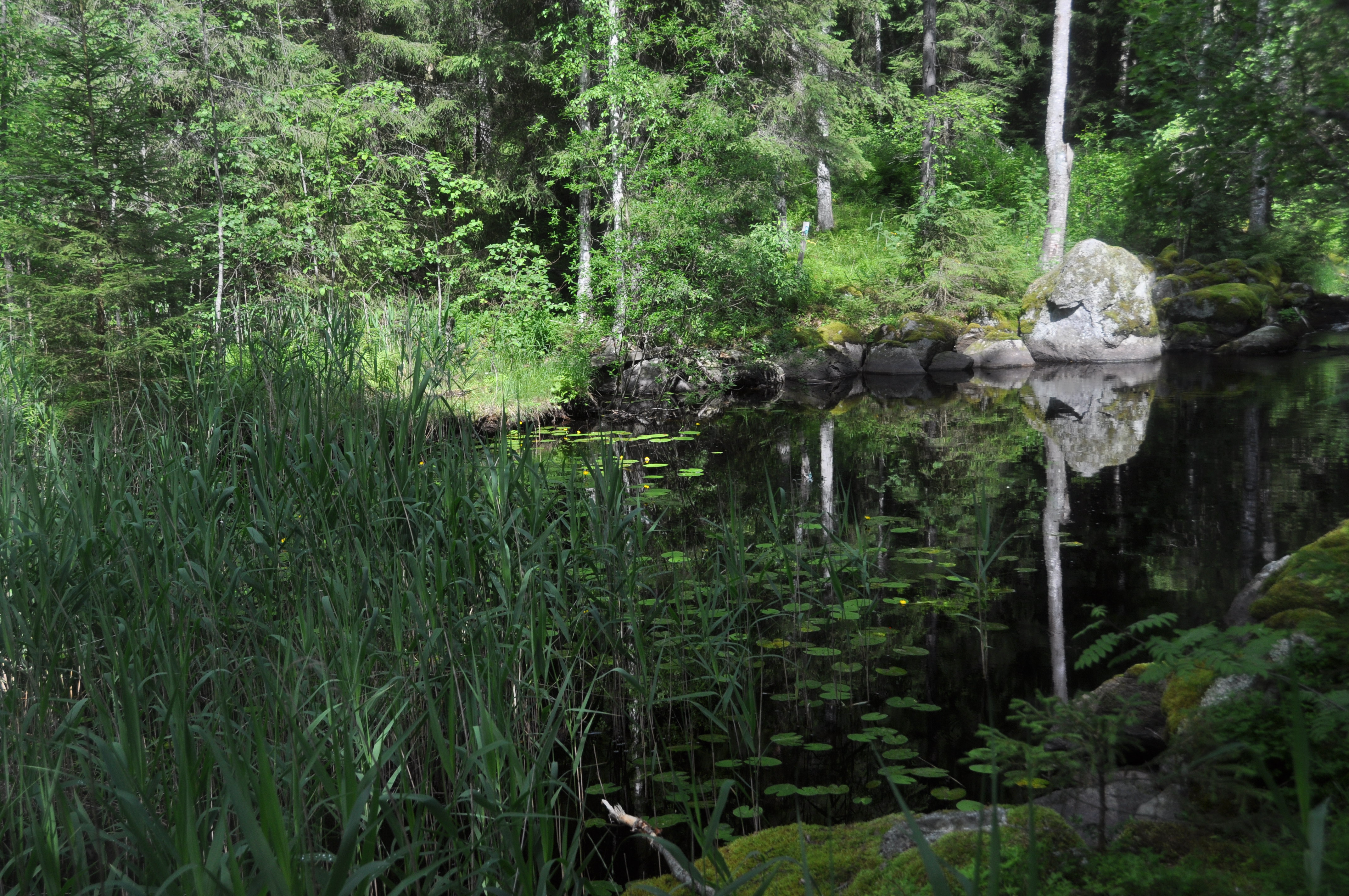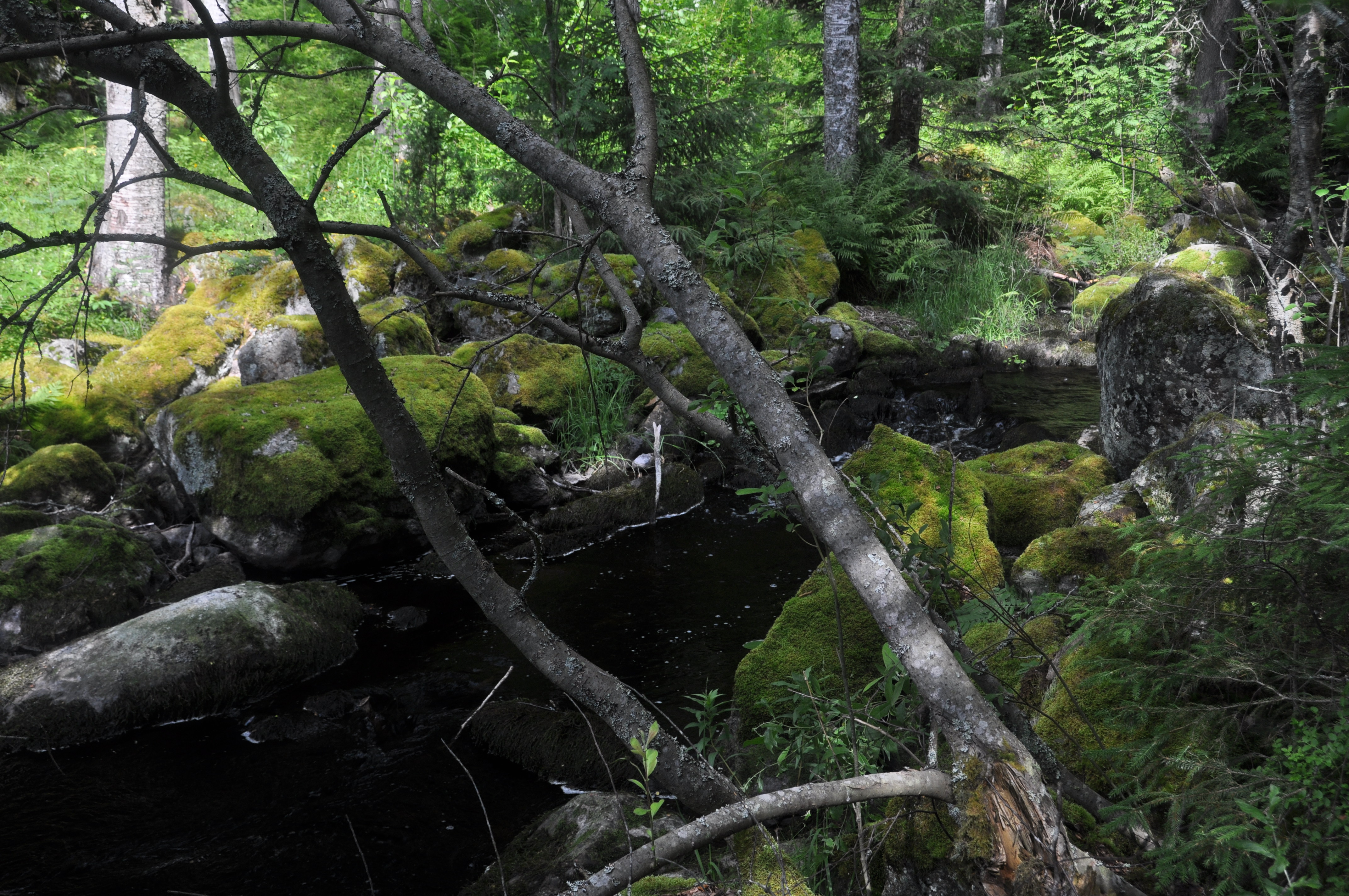 Maisemat olivat tänäänkin hyvin monimuotoiset. Alkumatkasta kävelimme jo tutun hakkuu-/kulotusaukean poikki ja sen jälkeen jatkoimme vehmaassa metsässä. Pian saavuimme järven rantaan ja erityisen idyllisen hieman ”peikkomaisen” puron rantaan, joka yhdisti kaksi järveä. Teimme jälkimmäisen järven jälkeen pienen ”sisämaalenkin” josta palasimme hiljalleen takaisin edellisen päivän reitillemme. Loppumatka käveltiin samaa reittiä takaisin, mutta ei haitannut yhtään, maisemat olivat todella hienoja!