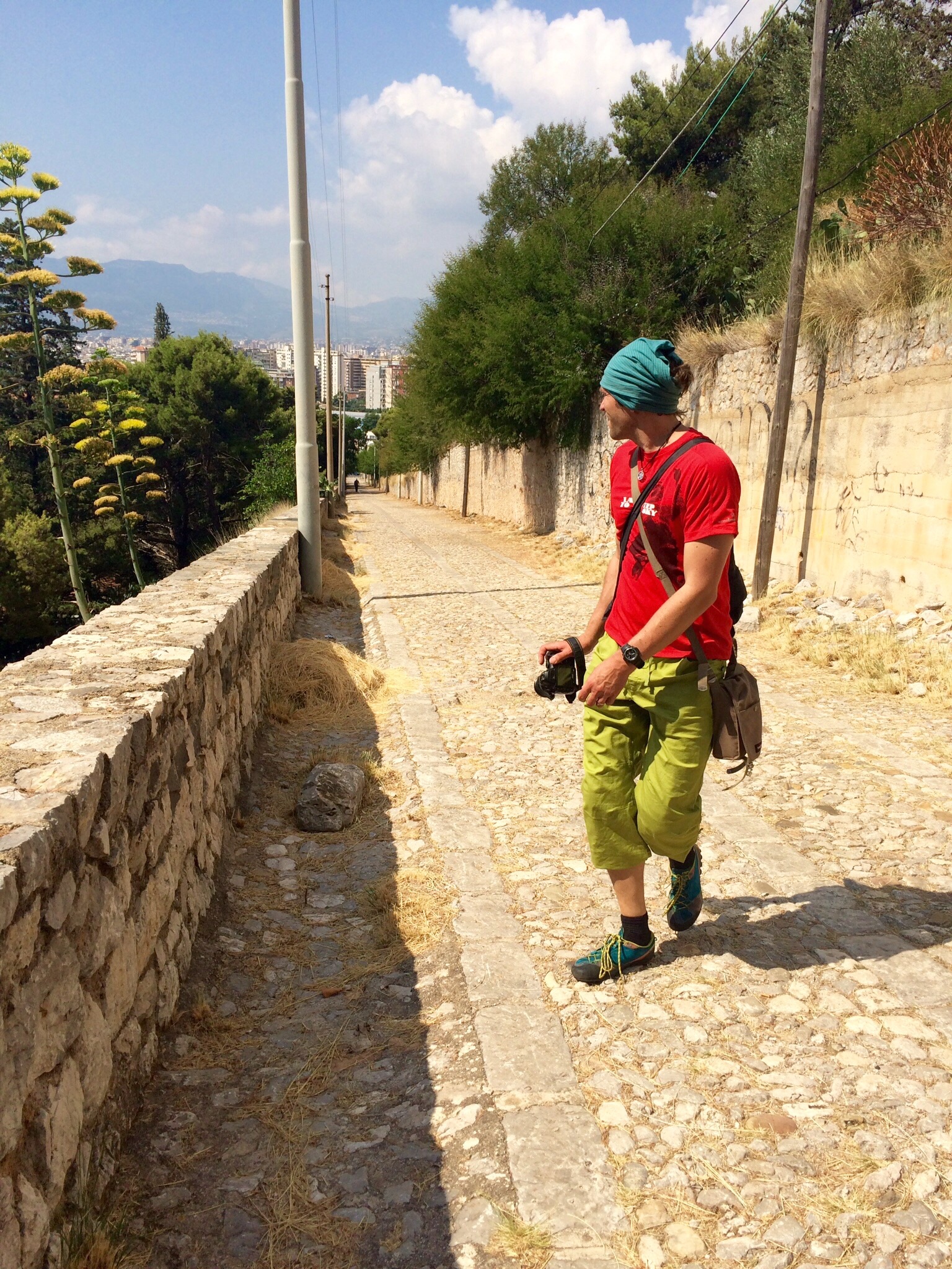 Palermo sijaitsee keskellä komeita kiipeilyseiniä. Näin oletin jo ihan ensimmäisen vilkaisun perusteella ja sain asialle vahvistuksen Parco delle Madonien puiston agriturismossa, jossa yksi majapaikkaa pitävistä veljeksistä harrasti kiipeilyä ja tunsi Palermon kiipeilykalliot. Tällä reissulla ei kuitenkaan kiipeillä, eikä kyllä olisi kuumuuden takia voinutkaan kiipeillä. Sen sijaan lähdimme tutustumaan aivan Palermon keskustan tuntumasta nousevaan Monte Pellegrinoon jalkapatikassa. Lähdimme ”heti aamusta” eli noin klo 9, joka ei tietysti ole oikeasti aamu, jota osoittaa jo sekin, että kun pääsimme vuoren juurelle, meitä tuli jos vastaan ne oikeasti aamulla lähteneet…