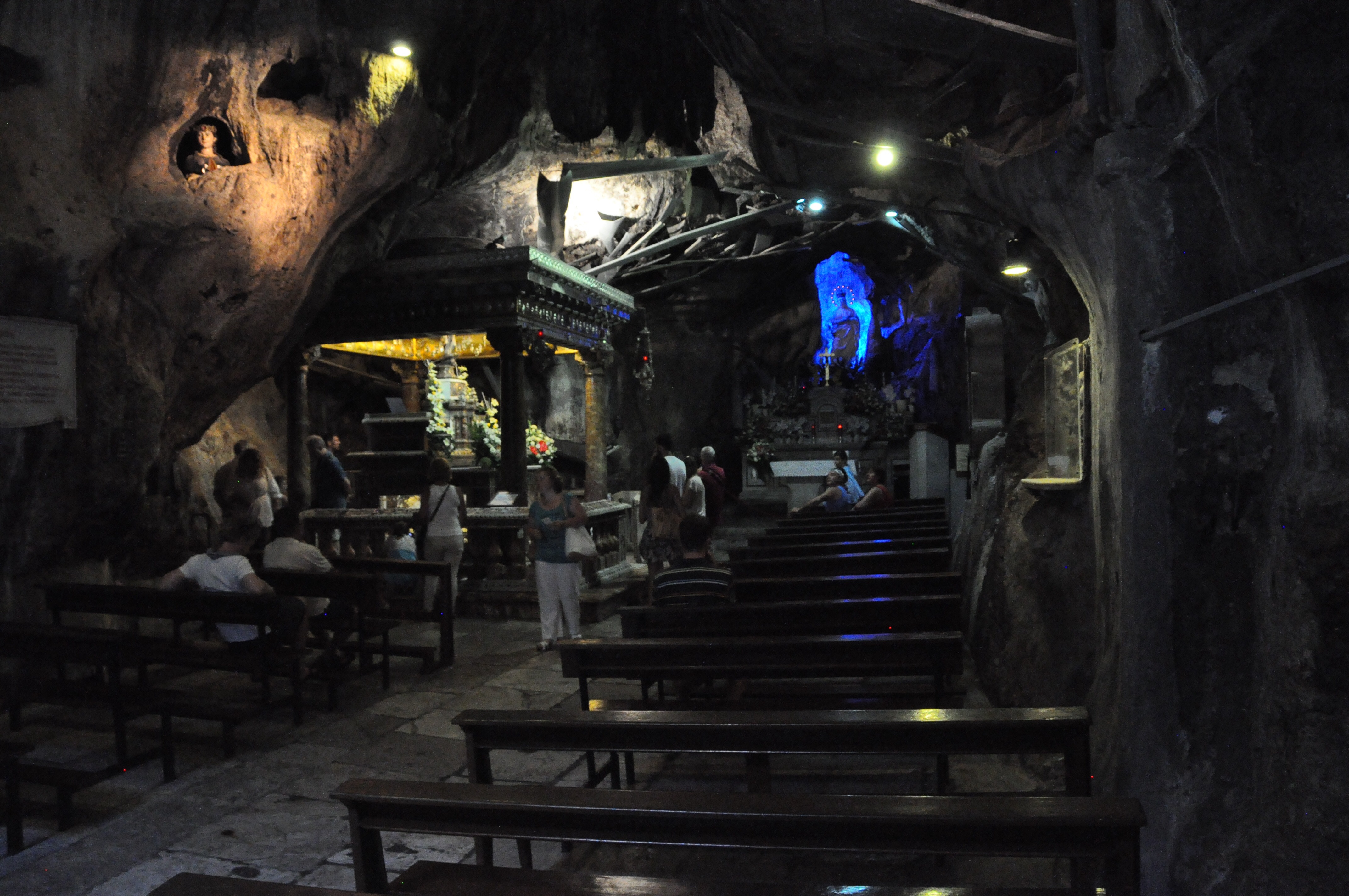 Retken nähtävyys oli kallioon louhittu pyhäkkö Santuario di Santa Rosalia. Kallion sisälle louhitun kirkon alttarin taustalla sinistä valoa hehkunut jeesus-krusifiksi oli todella vaikuttava! Vaikuttavat olivat myös pyhäkön edustalla olleen kahvibaarin isännän meille omasta ehdotuksestaan tuoreista appelsiineista vääntämät appelsiinigranitat! Uskomatonta miten hyvä hedelmä appelsiinikin oikeasti on…