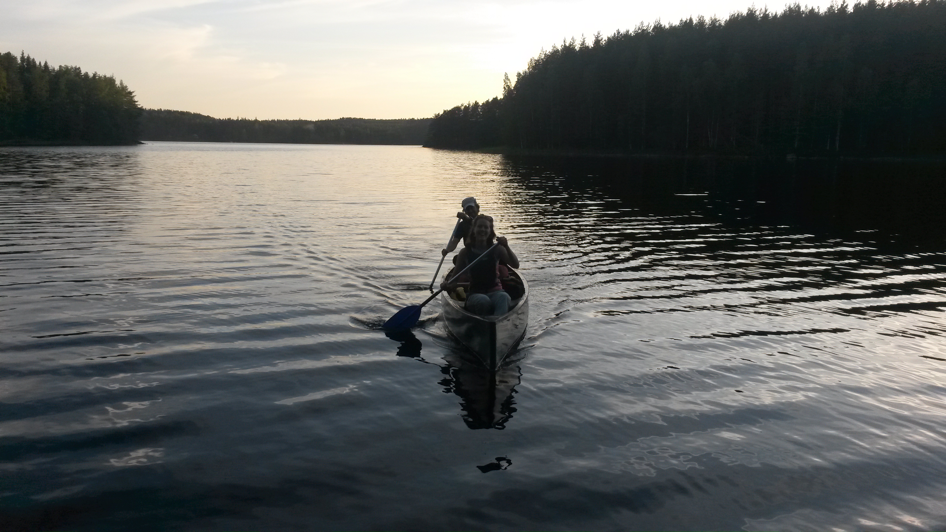 Anne ja Päivi tulivat polkujuoksukamoissa vastaan kun palailtiin leiriin päin. Nilkkavaivojen takia ei ollut asiaa mukaan, mutta sain onneksi Mikosta seuraa melontaan ja tehtiin inkkarilla komea iltalenkki Kuutin kanavan ja Lapinsalmen riippusillan kautta. Illalla tehtiin poronkäristykset leiritulilla ja vaan nautittiin.