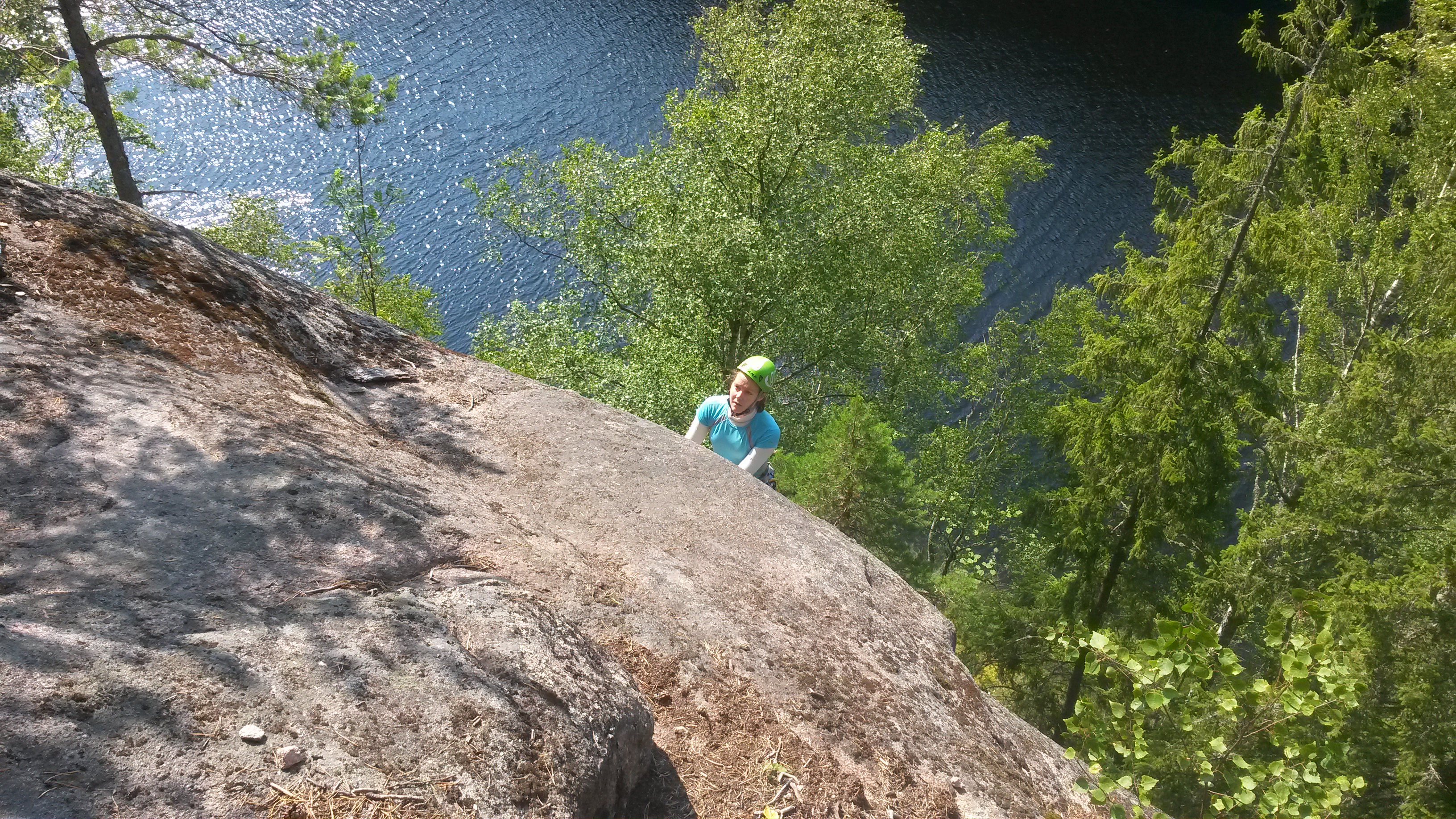 Yläköysittelykin oli silti harvinaisen upeaa, kun alkuun aina laskeuduttiin ihan tyynen järven pintaan asti ja siitä sitten ylöspäin mielenkiintoista otekiipeilyn ja släbin yhdistelmää. Idyllin rikkoi yllättäen kauhistunut huudahdus viereiseltä reitiltä, jossa Anne ja Päivi kiipesivät reittiä Koira nimeltä Ella (5+). Enpä ole ikinä nähnyt köyttä sellaisessa kunnossa missä Anne omaansa hinasi ylös, Päivin ollessa vielä alhaalla toisessa päässä. Mantteli oli kahdesta kohdin aivan rikki, ydin sentään ehjä mutta hurjalta näytti silti.