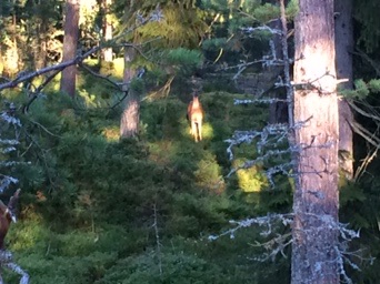 Perillä olimme melko myöhään illan suussa. Parkkipaikka oli melko tyhjä, ei ruuhkaa siis. Lähdimme kävelemään leveää polkua pitkin kohti niemen kärkeä. Onko polku muka aina ollut näin leveä koko matkan rantaan asti? Pätkiikö muisti vai onko polkua levennetty? No ehkä sekä että. Melkein heti alkuun polun vieressä tökötti peura. Siinä se tökötti kuin patsas ja siihen myös jäi. Jatkoimme eteenpäin…