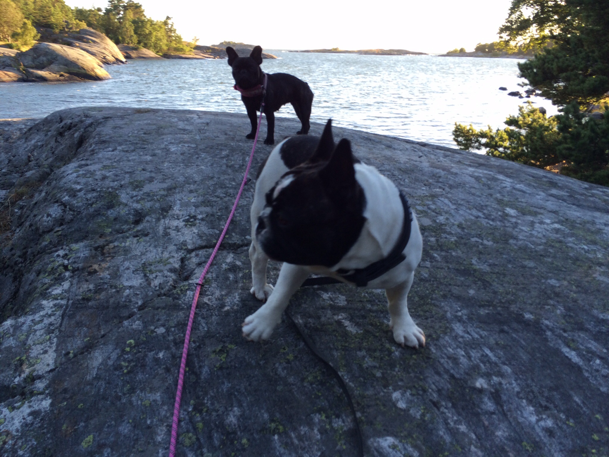Aamulla ihmettelin, kun erityisesti Lulu aloitti vahtimispuhinan varmaan jo klo 06. Vähän ärsytti kun heräilin jatkuvasti. Joskus kahdeksan jälkeen kömmin sitten ulos ja ihmettelin kun ranskikset tunkivat ulos ulkoteltan liepeen alta heti kun sain sisäteltan vetoketjun auki. No niillä oli kiire tervehtimään hyvissä ajoin aamulla lintuja bongailemaan tullutta vanhempaa miestä. No siinä ne sitten katselivat merelle porukalla, kun minä söin aamiaiseksi vähän kuivaa leipää ja pari hedelmäsiivua. Olin unohtanut aamiaistarvikkeet, höh.