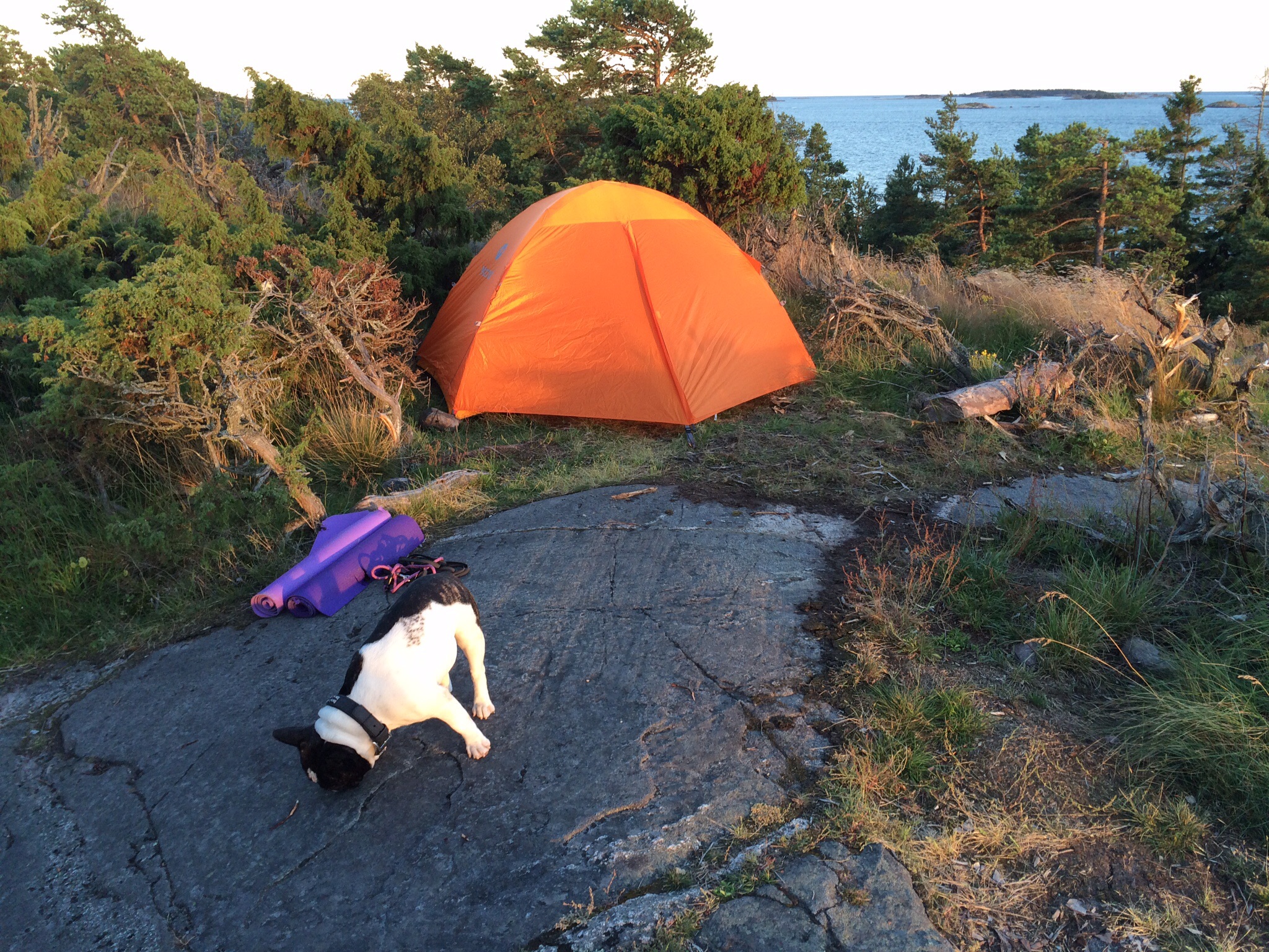 Jatkoimme aivan niemen kärkeen saakka ja pistin teltan suunnilleen niemen kärjen korkeimmalle kohdalle upeisiin maisemiin. Melkein kuin tunturissa olisi! Tai Ruotsin länsirannikolla. Upea paikka! Illan mittaan söimme, keittelin espressot, kuvailin, teimme iltarundin niemessä ja Lulu ja Uuno juoksivat tyytyväisinä sekopäinä ympyrää. Koirat tykkäävät telttailusta!