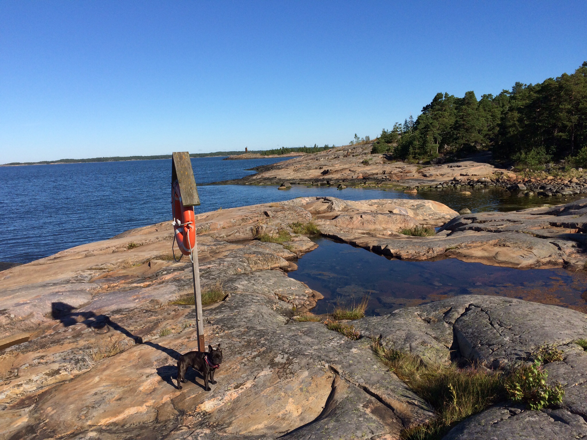 Pakkasimme teltan ja kävelimme ympäri Porkkalanniemen alueen. Saimme kierrokseen kulumaan 3.5 h kevyellä tahdilla. Ihan auton lähellä Uunolla sitten tuli vissiin kuuma ja Uuno bongasi kallion kolossa ehkä puolen metrin syvyydellä olleen suonsilmäkkeen johon piti hypätä! Ja tassuhan siinä loukkaantui… sunnuntaina rupesi vaivaamaan ja maanantaina lääkäriin…onneksi vain revähdys… Kyllä se Uuno keksii!