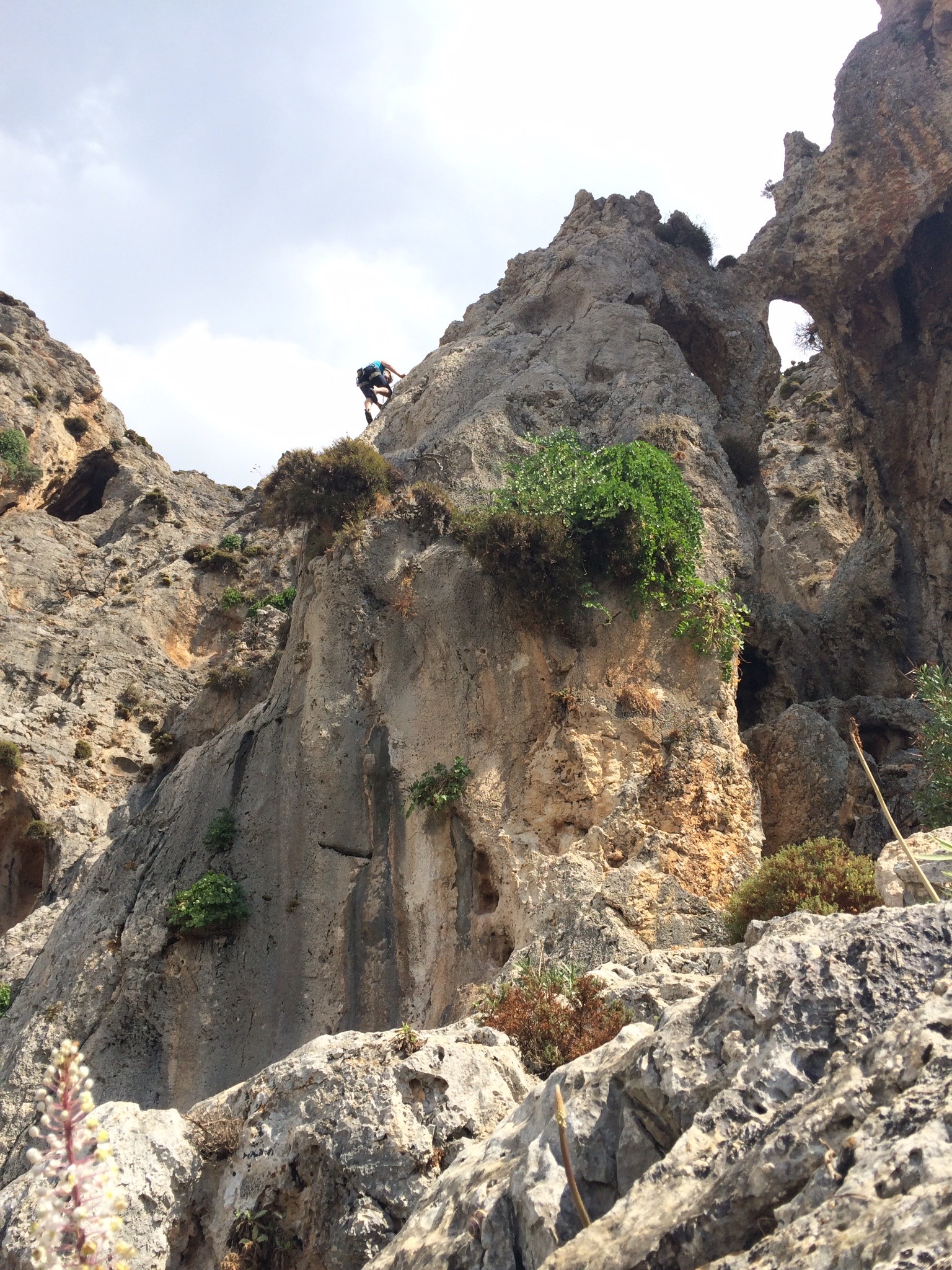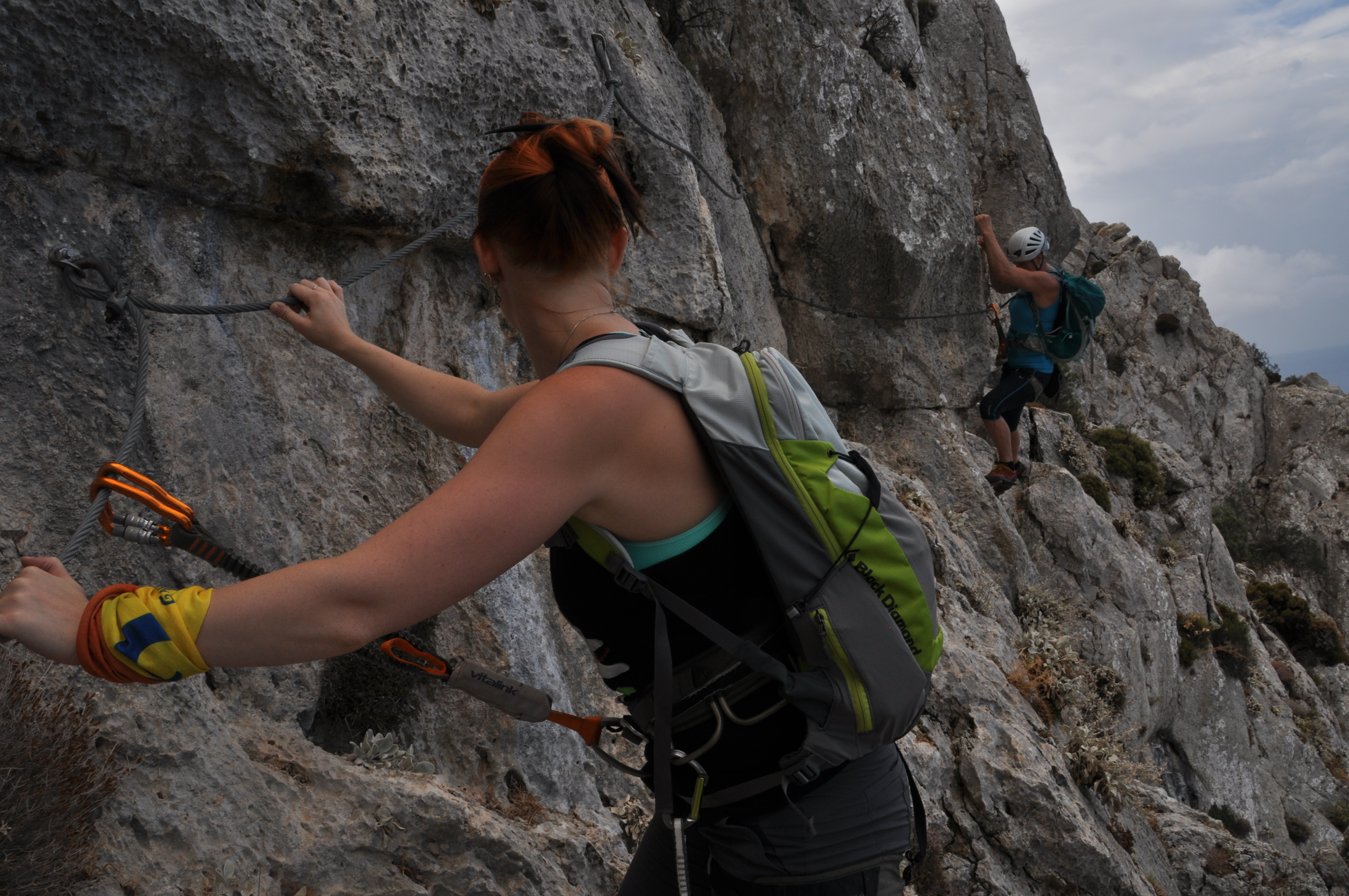 Kiipeily on Kalymnoksen suurin juttu, mutta ei ainoa ajanviete. Massourin kylän yläpuolelle on tehty suorastaan vaikuttava Via Ferrata. Reitille kavutaan ensin polkua pitkin, sitten kiivetään pätkä noin kolmosta jonka jälkeen päästään itse ferratalle, joka kulkee diagonaalipoikkarina korkealla Massourin ja meren yläpuolella. Maisemat ovat mykistävät! Olen vetänyt muutaman via ferratan Cortina d’Ampezzossa, mutta tämä on yksi komeimmista. Alun kiipeilyosuudella on pultit ja niitä on ehkä syytä hyödyntää, jotta ei satu lipsahdusta. Me kuljimme tämän pätkän kolmen hengen alppiköysistönä. Meneehän se varmajalkaiselta ilmankin, mutta turvallisempi köyden kanssa ja kun köysi kerran on mukana, niin ferratan huipulta voi tehdä komean laskeutumisen reitillä olevan korkean luolan editse. Laskeutuminen on 35 metriä pitkä, joten vähintään 70 metrinen köysi tarvitaan. Meillä ei ollut kuin 60 metrinen, joten jätettiin laskeutuminen seuraavaan kertaan ja toisaalta laskeutumispulttikin näytti olevan hankalahkossa paikassa