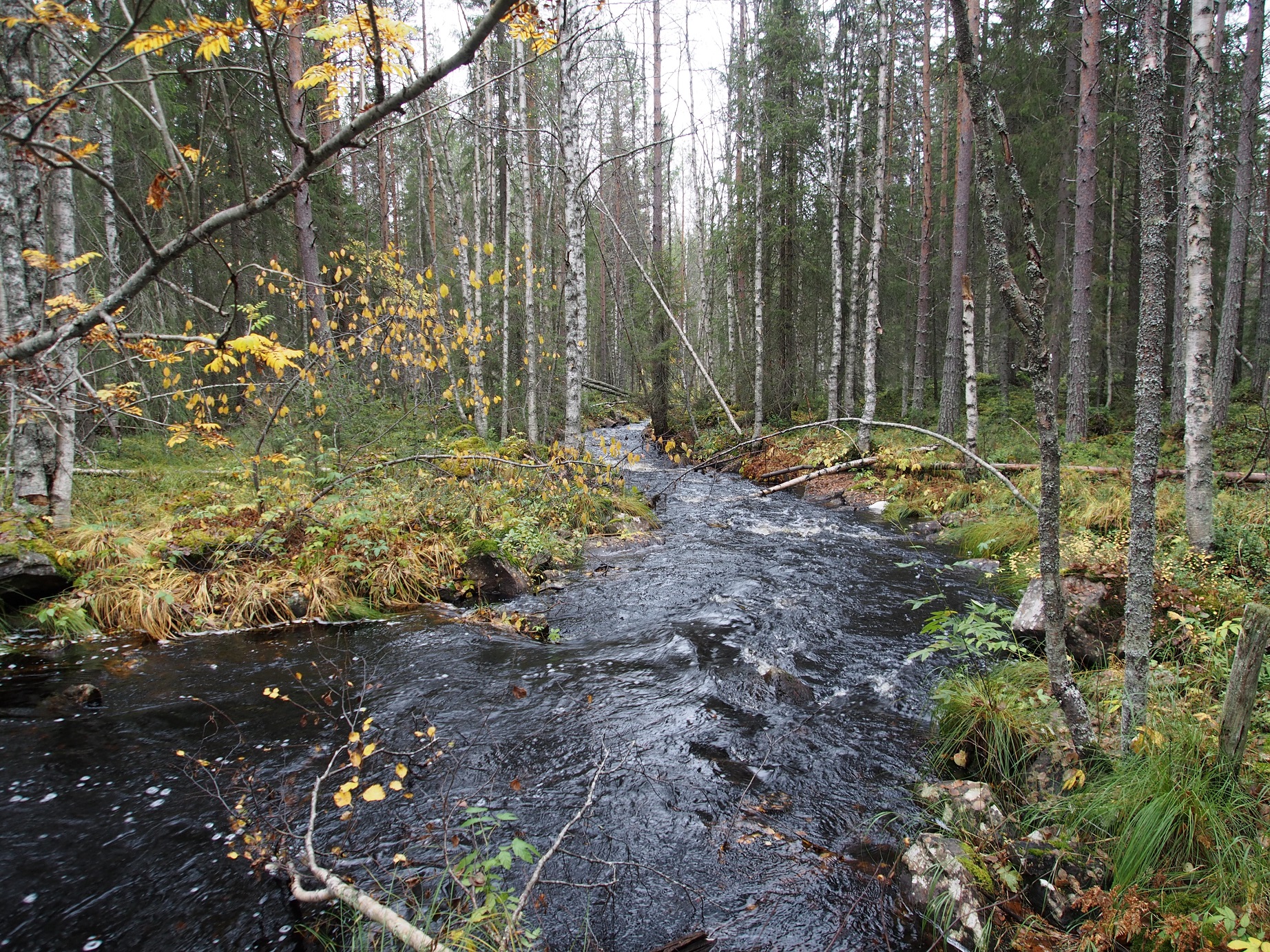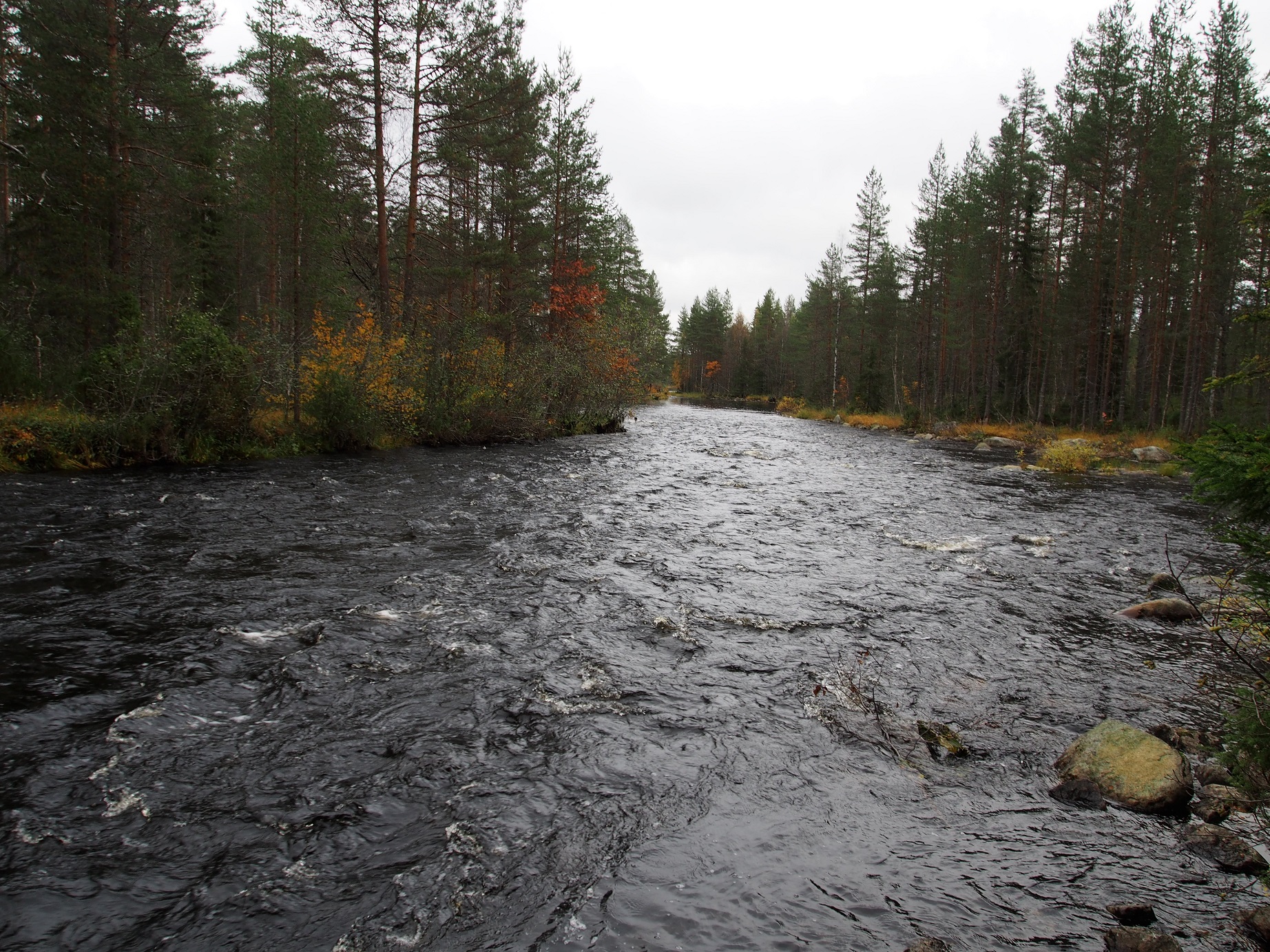 Kellojärven ruovikot, joensuun pato ja ensimmäiset kivikot menivät huomaamatta. Padolla joutui nostelemaan kajakkia pikkaisen käsien varassa, mutta jalkautua ei tarvinnut. Alun suomaiden läpi mutkittelevat osuudet menivät leppoisasti. Joku oli tainnut virittää joen törmälle oman lintupasiin ja taukolaavut. Kun joki sukelsi metsään ja maasto ympärillä vaihtui kuivemmaksi ja korkeammaksi muuttui myös virta kapeammaksi ja vesi lähti liikkumaan vinhaa vauhtia. Maisemia ei enää ehtinyt niin paljon ihmetellä kun mutkaisessa rännissä meno oli koko ajan päällä. Ensimmäinen pidempi koskiosuus jossa on mukana ihan kiveä ja loppupuolella vanhan polun kohdalla ihan jo pieni askelma oli ehkä kolmisensataa metriä pitkä. Täällä tuli vastaan myös ensimmäiset poikkipuut ja ne ovat nopeassa virrassa vastaan tullessa aika inhottavia. Niiden vastaanottaminen käsillä vaatii jo voimaa kun kajakilla on aika paljon liike-energiaa takana. Jalkauduin tässä kohdin ja kävelin vähän enemmän maastossa. Lopulta kuitenkin lasetin alas portaasta pienen kolinan saattelemana.