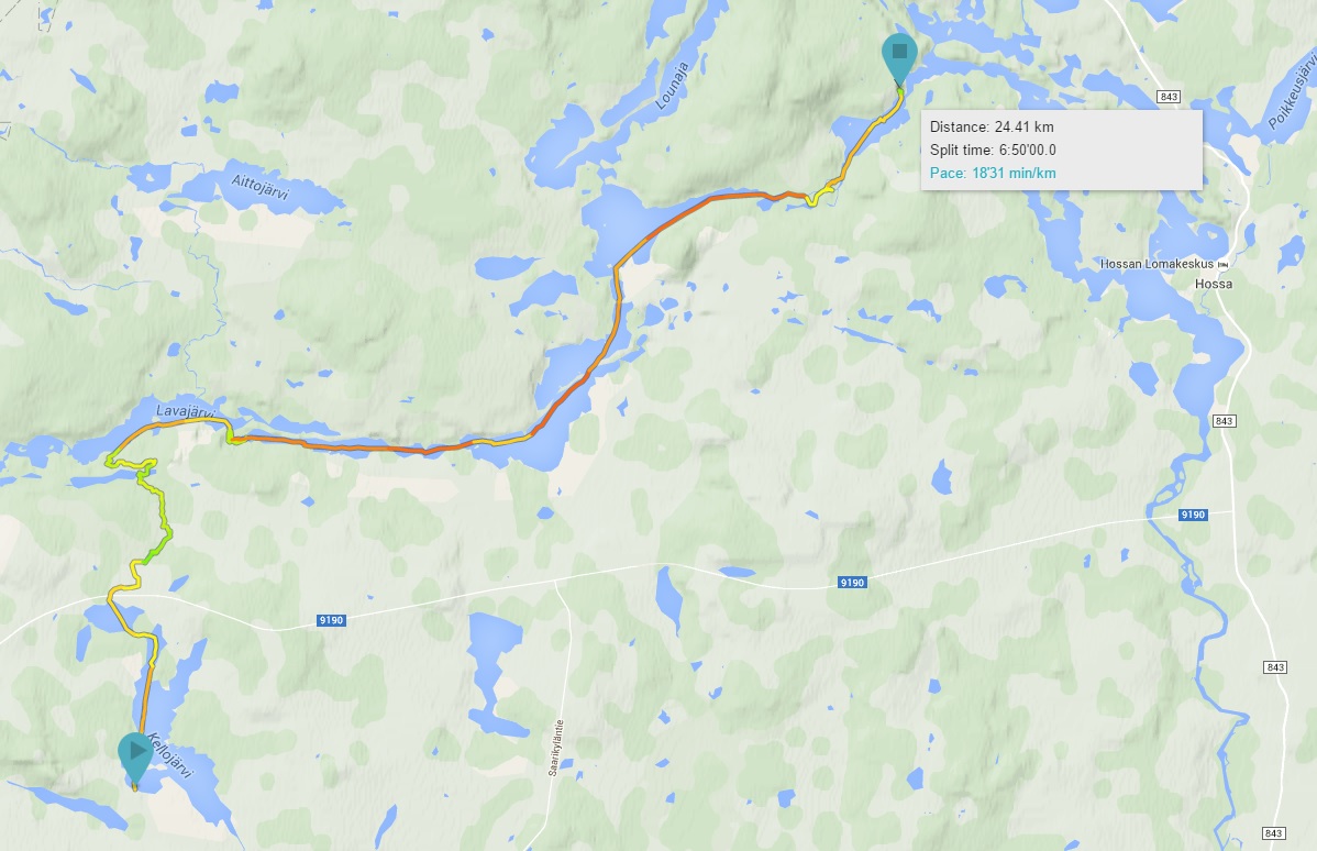 Matkaa kertyi yhteensä lähes 25 kilometriä. Aikaa meni lähemmäs seitsemän tuntia, mutta mukana on pitkä tauko Lavanjärvellä kun Eno tuli moikkaamaan hänen vanhalle skimbapaikalle harjun kupeeseen. Pidettiin siellä nuotiota, syötiin evästä ja katseltiin koski läpi. Päivä oli aika vilakka ja ison osan matkasta sai meloa pohjois-tuulta kohti. Silti oikein leppoisa päivä. Otettiin kajakki vedestä Jatkon kämpän kohdalla ja ajettiin takaisin Taipaleeseen. Tästä voisi kuitenkin helposti jatkaa Hossajokea kohti ja sitä alas Juntusrantaa kohti Kiannan aalloille. Tuon pätkän olen jokunen vuosi sitten melonut ja on komea reitti. Täytyy miettiä jos joku kesä tekisi pidemmän melontareissun Suomussalmen maisemissa. Pohjois-Suomussalmi on myös siitä mielenkiintoinen kohde, että alueella on useampi maanselkä. Kellojärvestä vesi valuu Hossan kautta eteläistä reittiä, mutta Hossan kylän pohjois puolen järvistä vesi lähtee laskemaan Iijoen vesistöä. Kolmas suunta on itään lähtevät joet, jotka laskevat Vienankarjalan läpi Venäjällä Vienan mereen. Kaikki vanhoja kauppa- ja kulkureittejä.